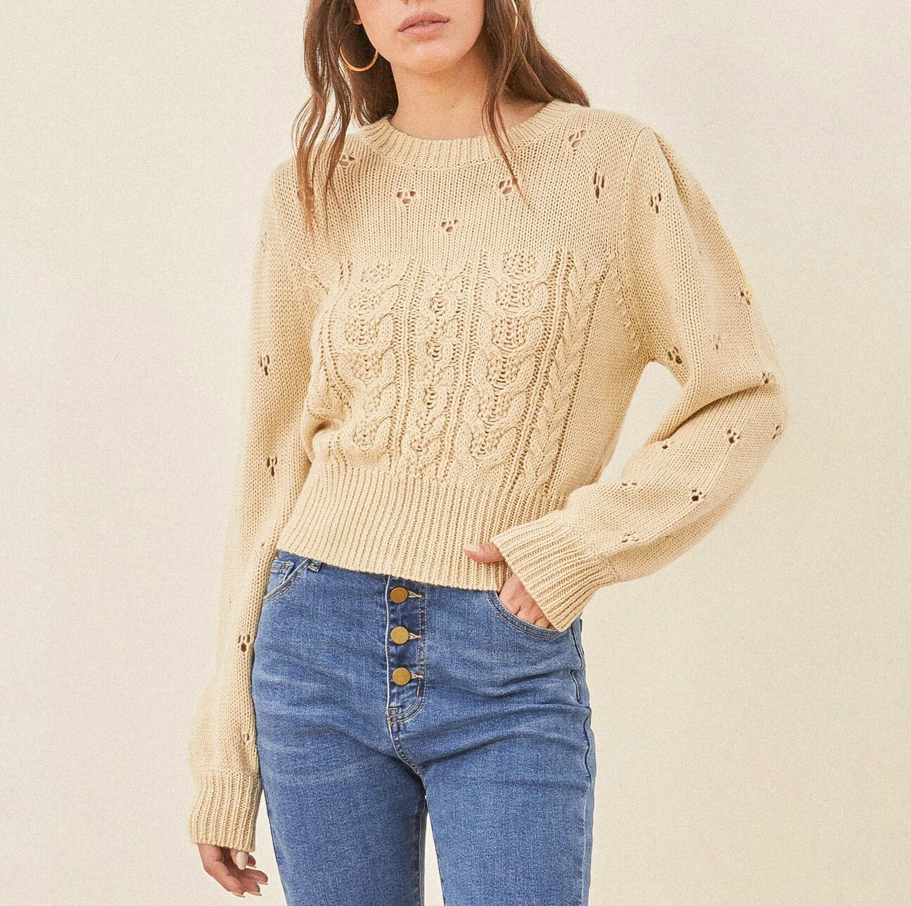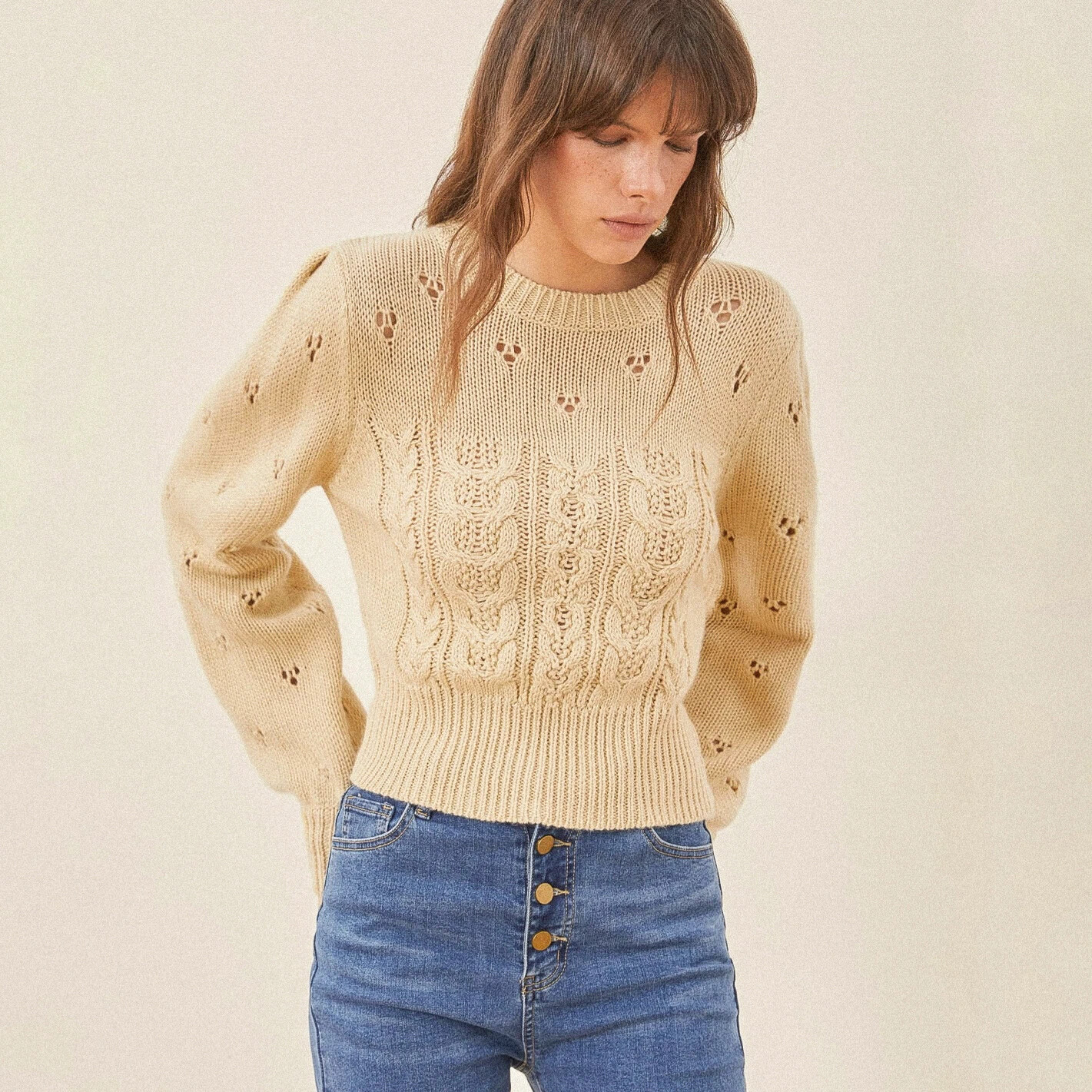 Модель Лилиана одна из таких: круглый вырез горловины, рукава со сборкой у основания, широкая резинка по нижнему краю и изящная панель кос по детали переда + минималистичный, но очень привлекательный ажур по кокетке, спинке и рукавам вещи.