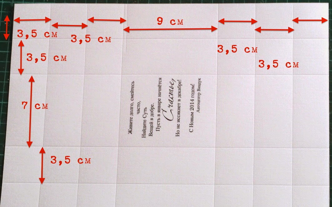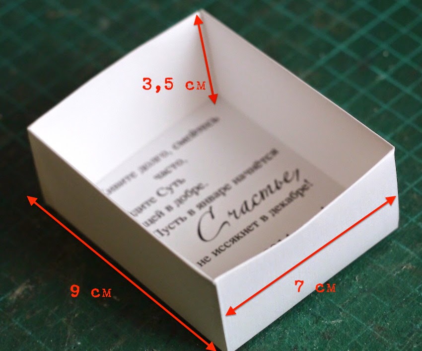 Нам понадобится лист, плотностью 140-180 гр/кв.м А4 формата, в центре которого вы можете распечатать любую поздравительную надпись, которая бы уместилась на дне коробочки, размером 7 х 9 см. Более плотную бумагу брать не советую, плотности 140 гр/кв.м будет достаточно, т.к. стенки получатся двойные. Пробигуем лист.