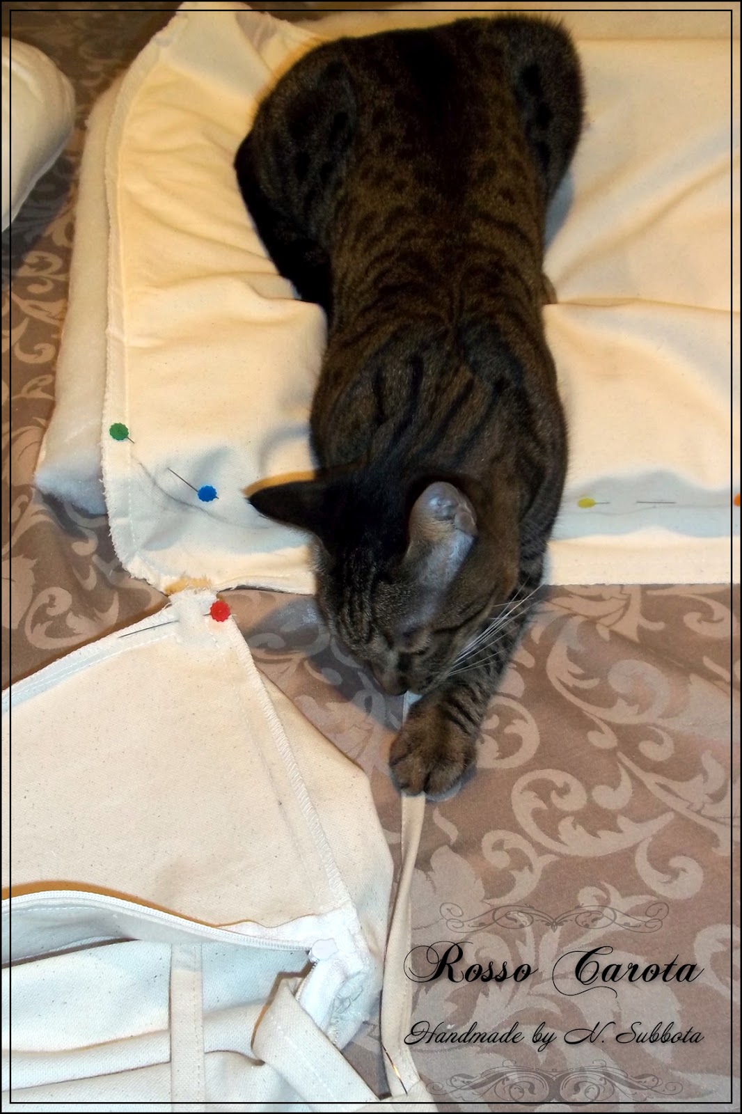Т.к. мои кошки любят раскачиваться в кресле, я решила сшить дополнительный съемный чехол, чтобы его легко было снимать и стирать, а подушка всегда оставалась бы чистой. Ткань из IKEA Bomull замечательно подошла и по цвету, и по фактуре, и по цене. Для удобства, я вшила замок-молнию и пару завязок с задней стороны чехла.