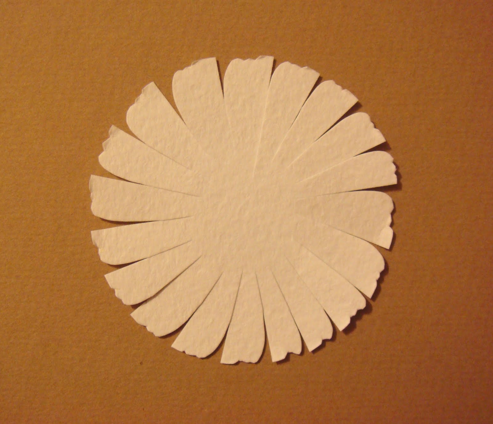 Круг складываем на 4 части, затем ещё пополам, делаем 3 надреза, каждый закругляем. Разворачиваем, делаем надрезы в складках, цветок готов.