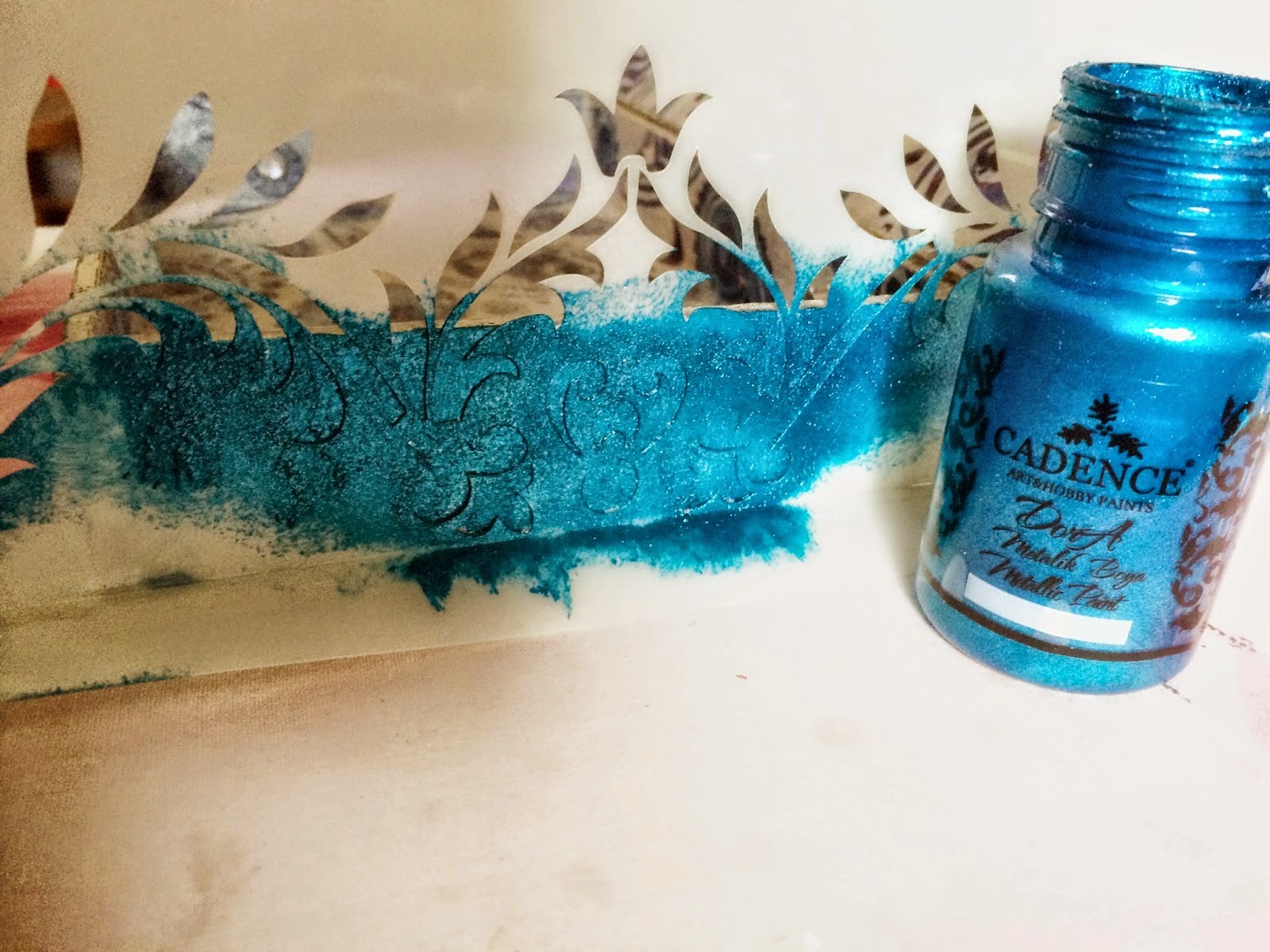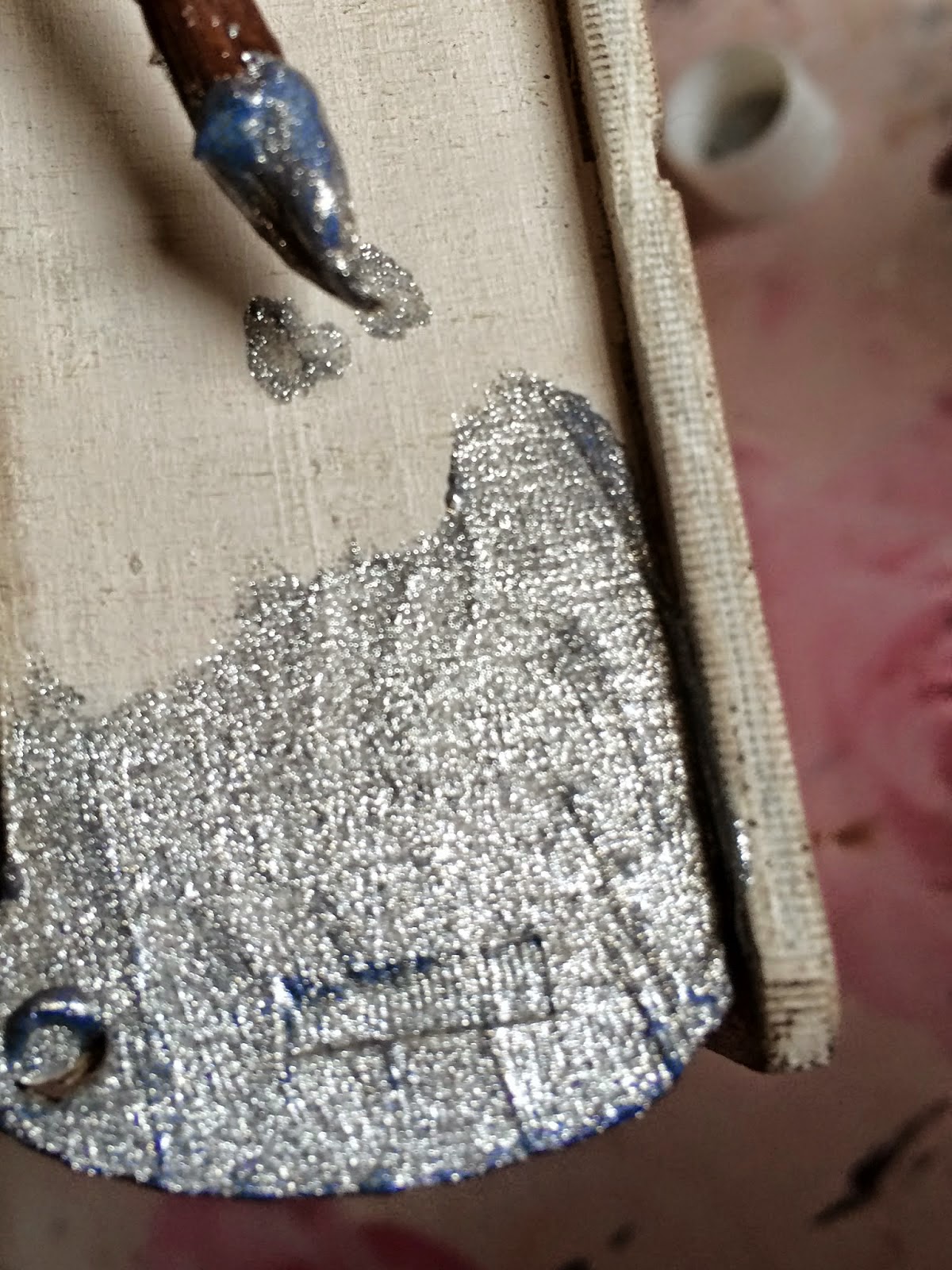 Боковины шкатулки красим краской "Даймонд". Краска ложится в один слой и создает серебряный, сияющий, металлический цвет!