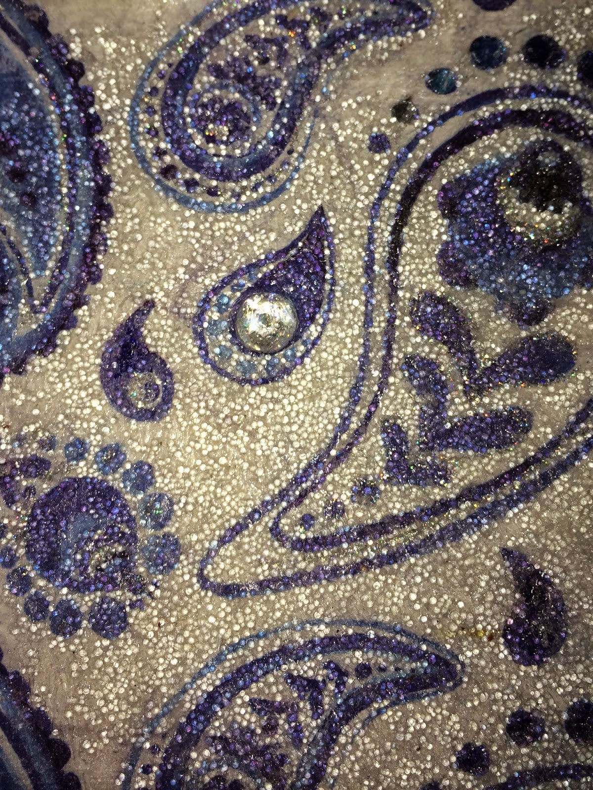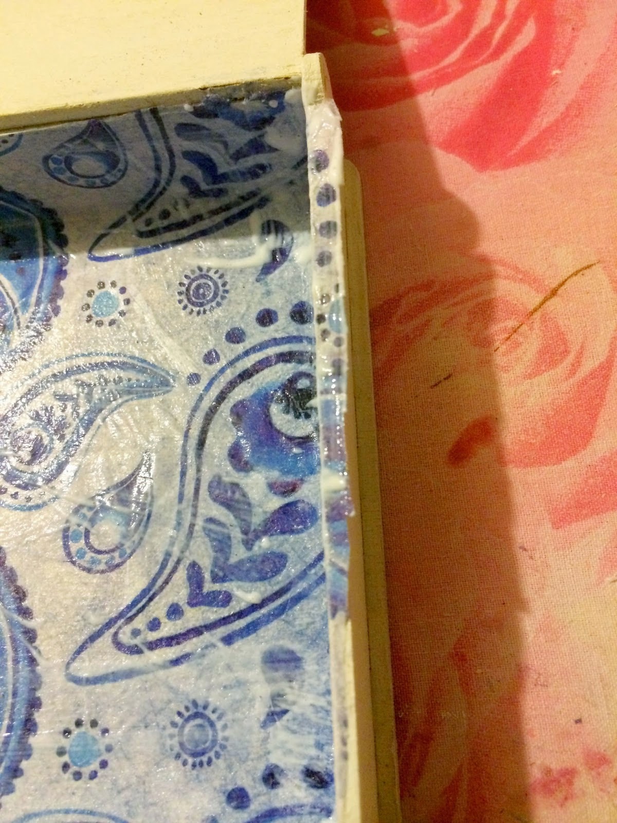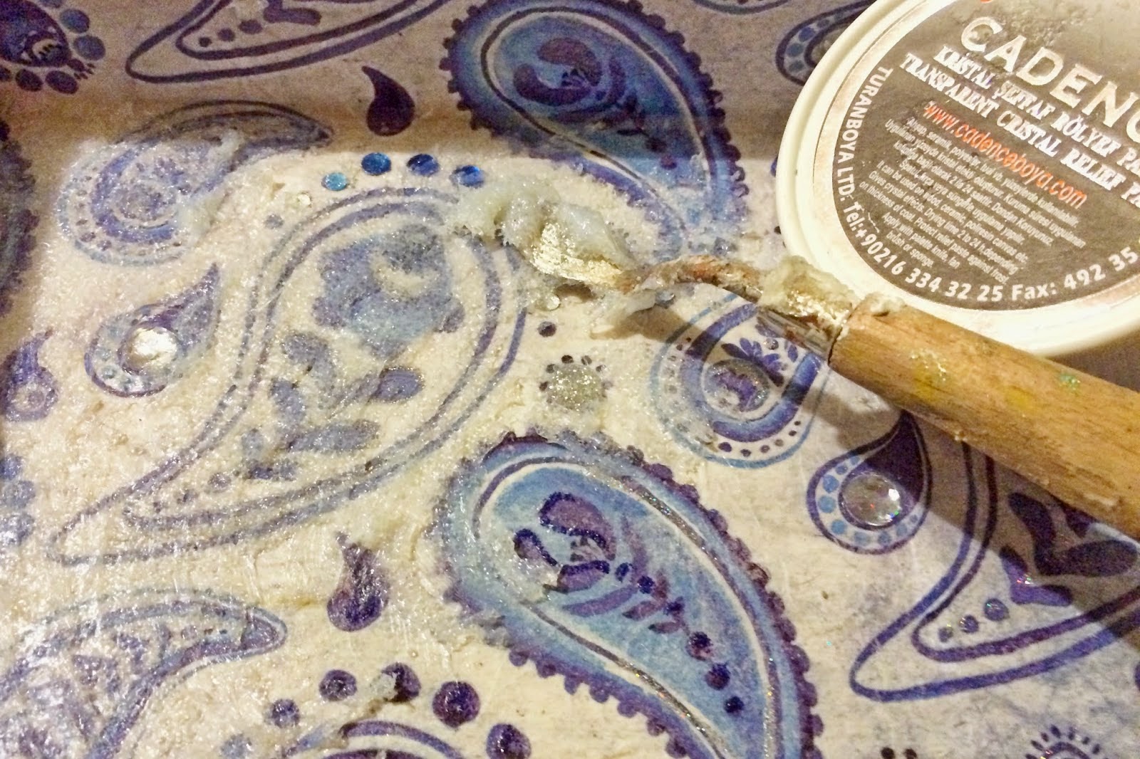 Внутреннюю часть шкатулки я решила декорировать "Хрустальной пастой CADENCE". Этот продукт понравился мне относительно недавно, но стала я его использовать достаточно часто. Для начала пасту необходимо очень тщательно перемешать, так как круглые хрусталики обычно оседают на дно. Если паста будет плохо перемешена, то хрусталики будут ложиться неравномерно. По своему составу это прозрачная глянцевая структурная паста с мелкими круглыми "бусинками". После тщательного перемешивания мы наносим пасту мастихином, тщательно размазываю по всей внутренней поверхности шкатулки, пытаемся ее выровнять, чтобы эти "бусинки" легли ровно в один ряд. Если вы хотите применять данную пасту на каком-либо изображении, то лучше она будет выглядеть на крупных рисунках. Паста по своей структуре очень прочная и ее можно даже применять на подносах, чтобы потом можно было ставить горячую кружку и не боятся пролить чай или кофе. Сохнет около 20 минут (без фена) при слое в одну "бусинку". Когда ее только нанесли, она может давать немного белесый оттенок, когда паста полностью высохнет она станет абсолютно прозрачной. Если вдруг где-то образовались выпуклости, Вы можете их зашкурить как и обычную структурую пасту.