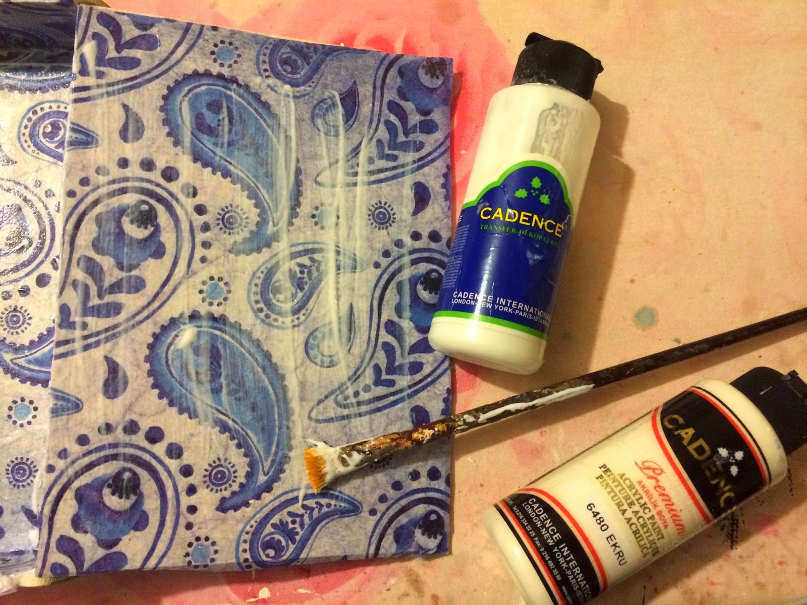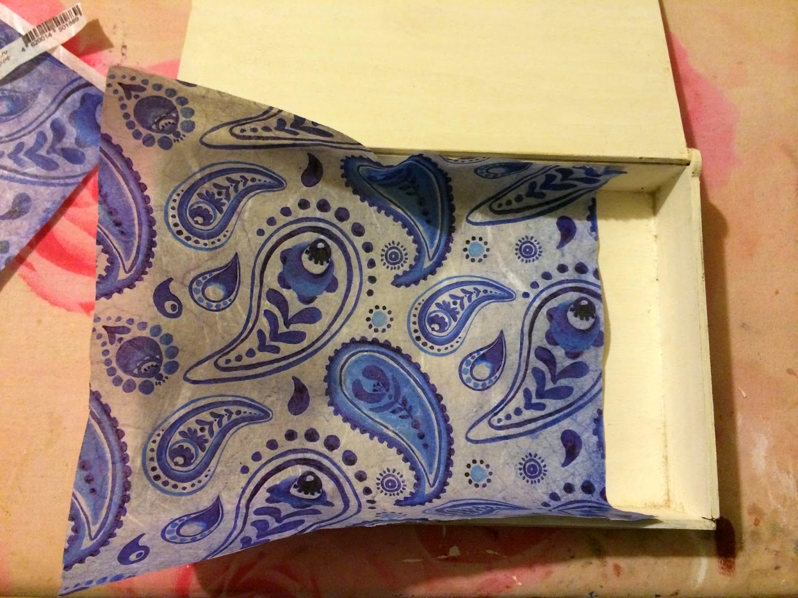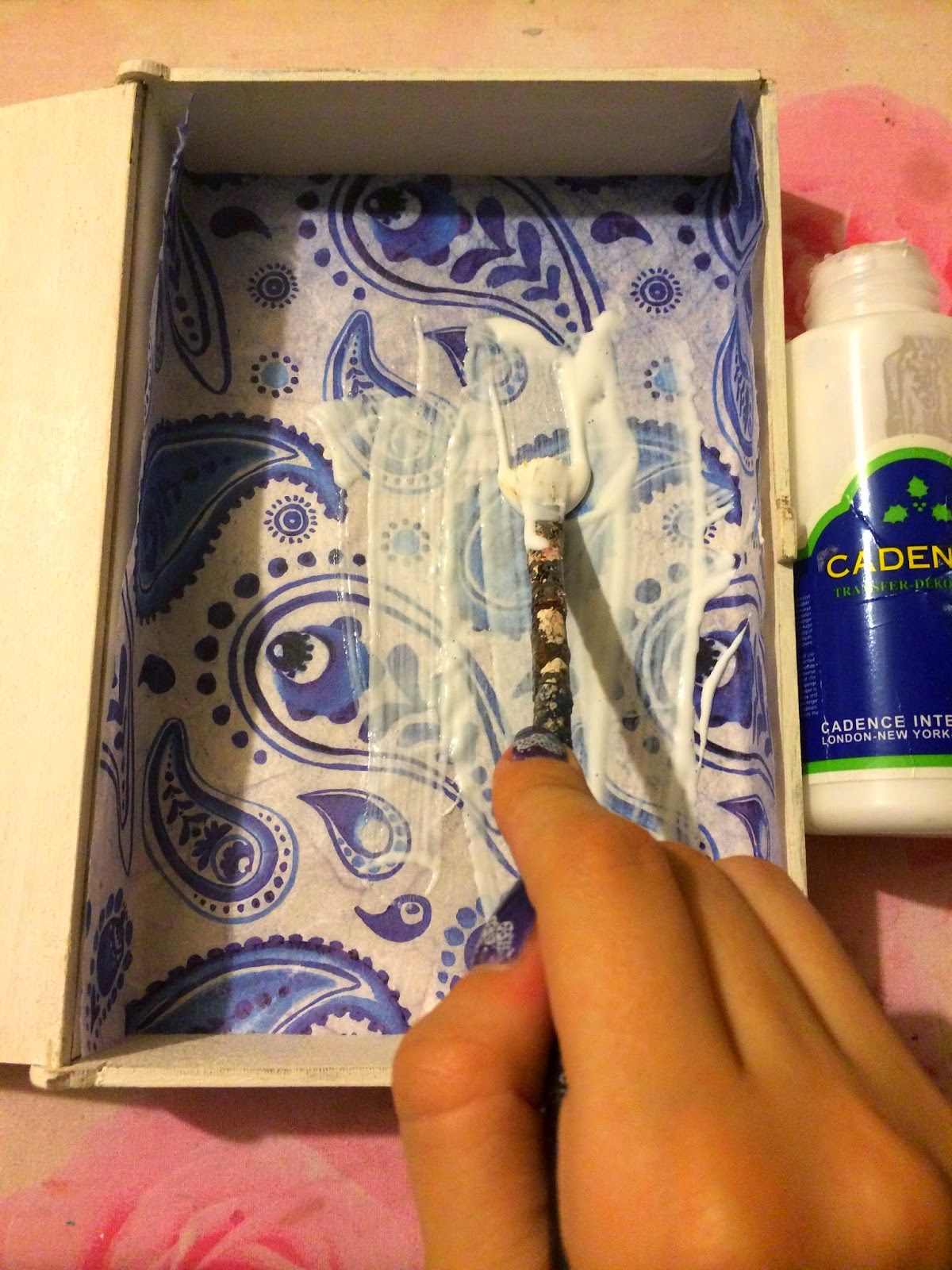 И теперь мы начинаем приклеивать рисовую бумагу к загрунтованной заготовке. Для приклеивания изображения используем "Универсальный клей для декупажа CADENCE". Внутрь я решила клеить "огурцы", а снаружи шкатулки будет цветочный мотив.