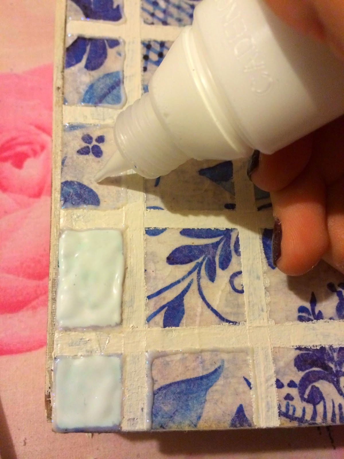 И начинаем наносить гель на каждую плитку, одну за другой, сначала гель белого цвета, но при высыхании он становится прозрачным.