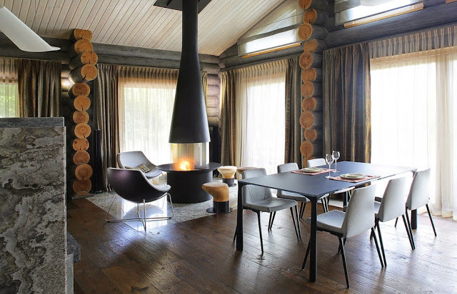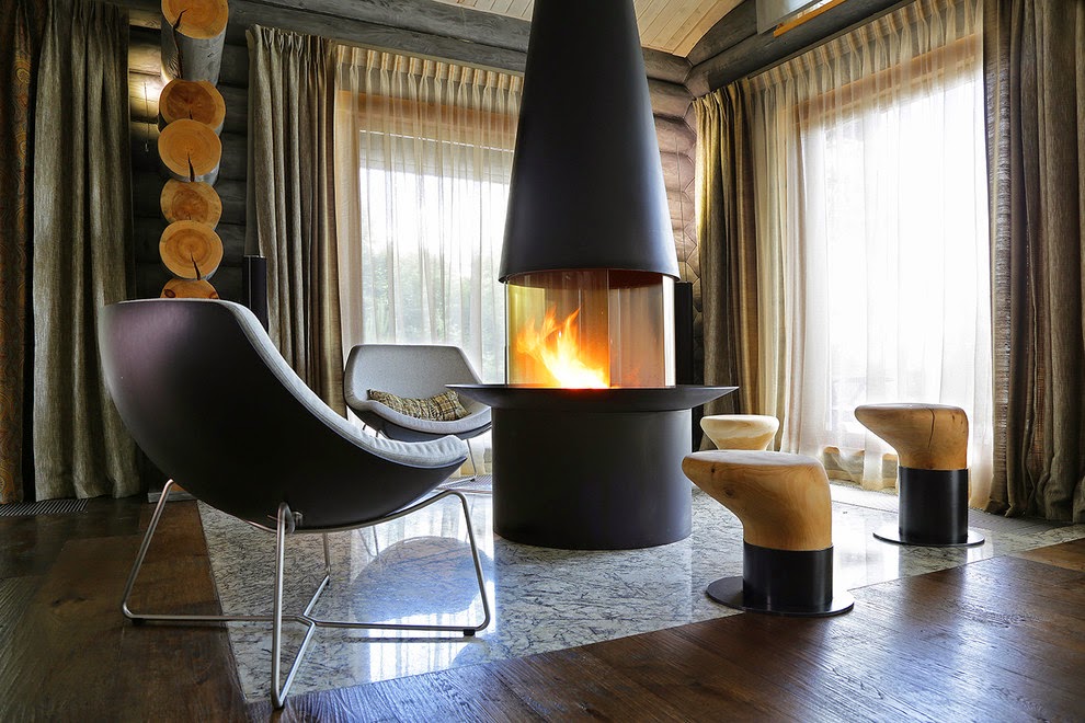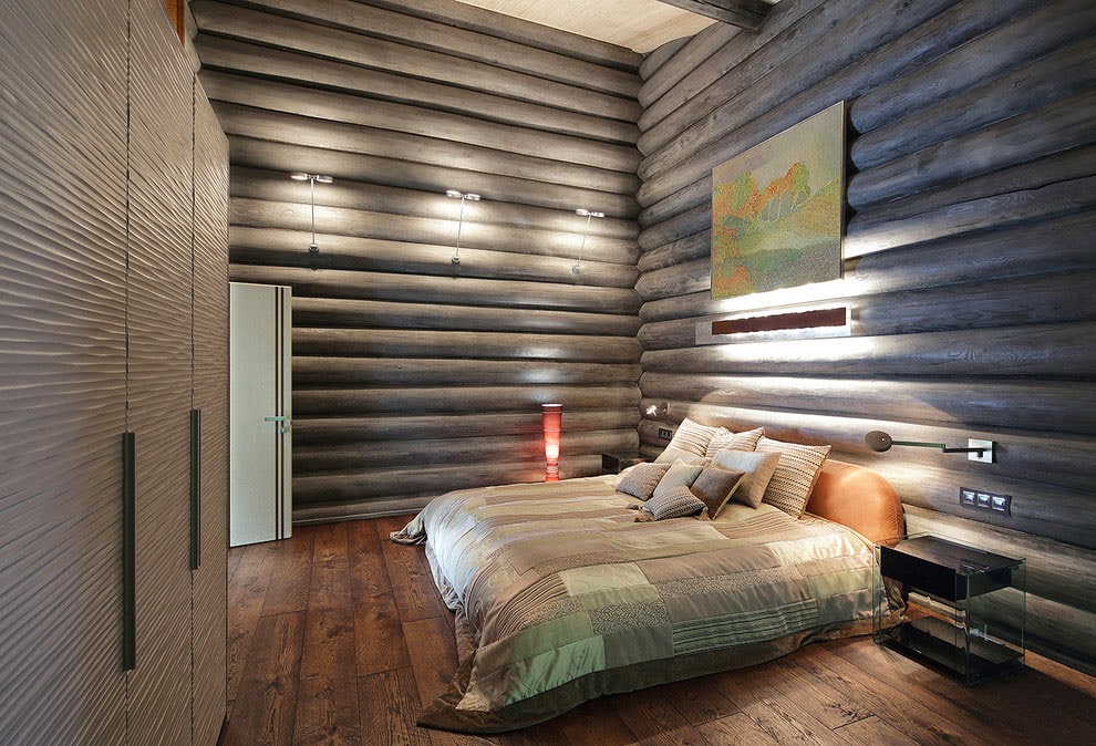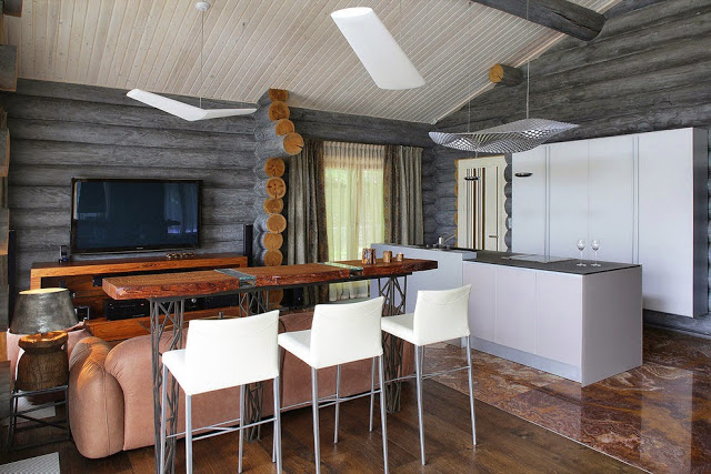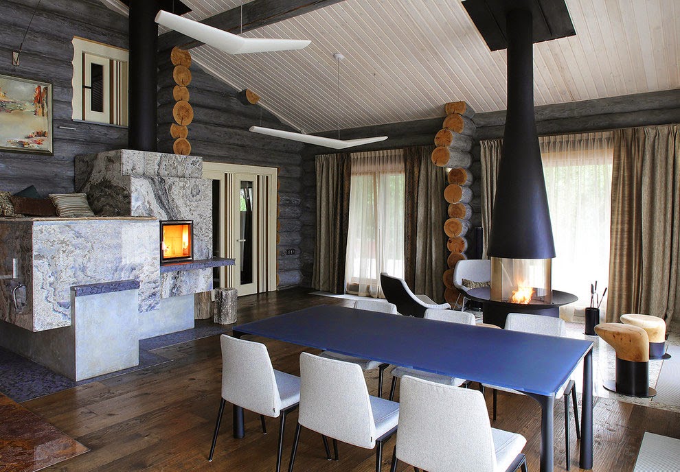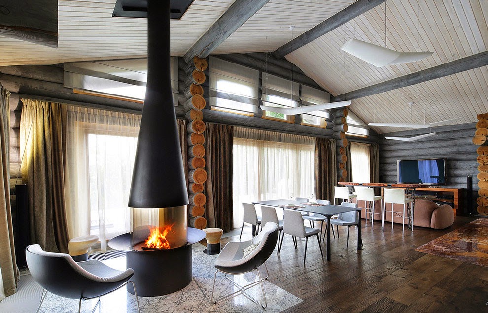 Современный интерьер бревенчатого дома разработан дизайнером Еленой Щербаковой.