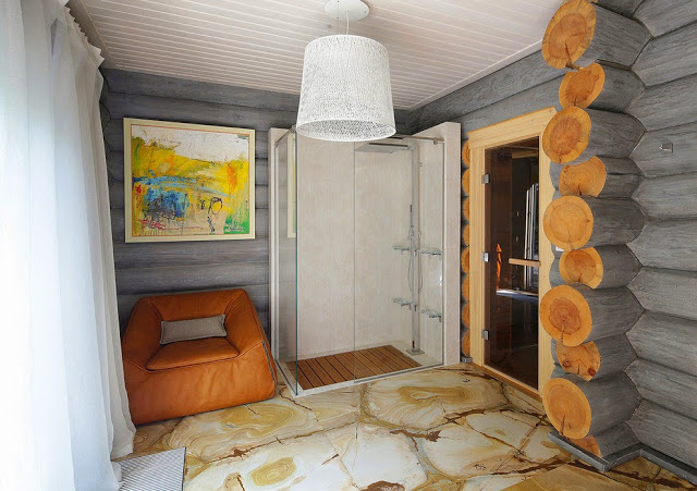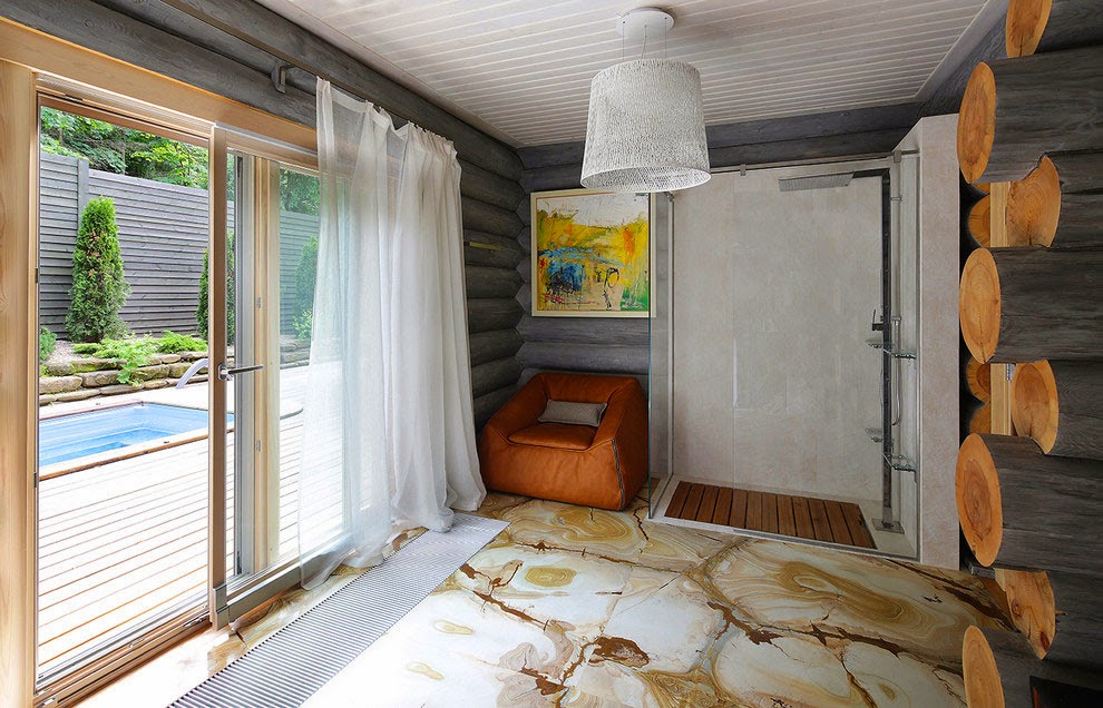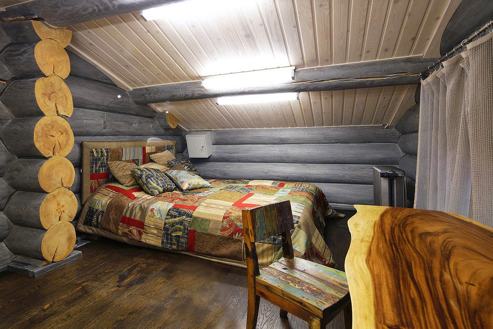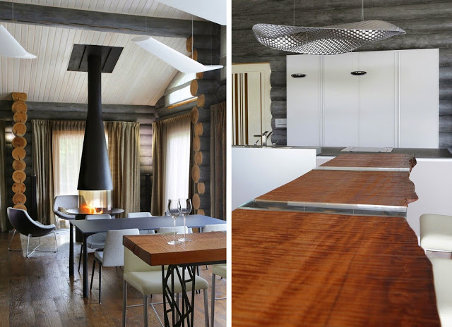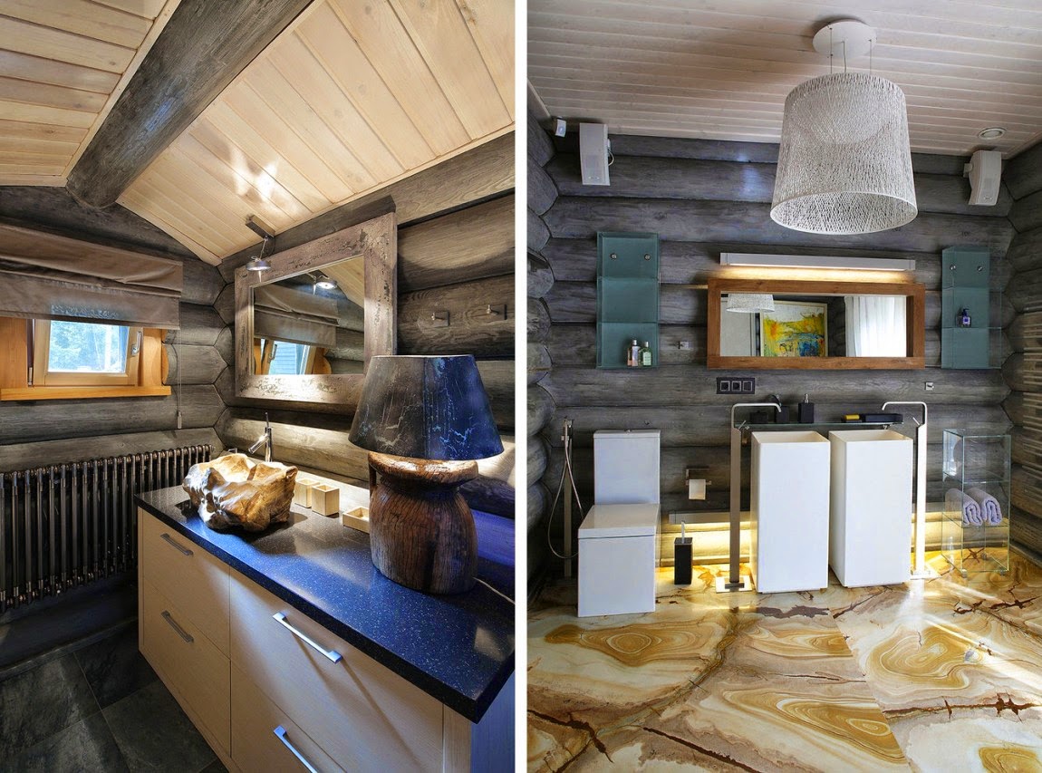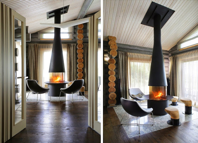 Современный интерьер бревенчатого дома разработан дизайнером Еленой Щербаковой.