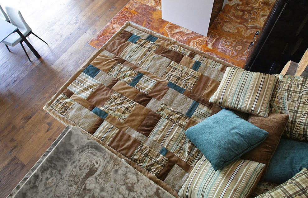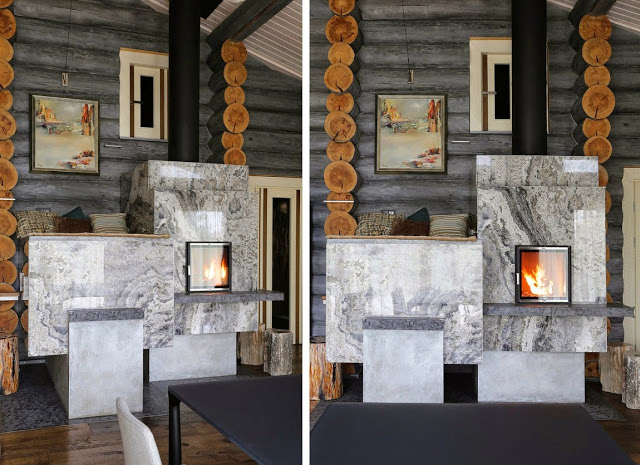 Интерьер бревенчатого дома продолжает нас удивлять интересными дизайнерскими решениями. Единое жилое пространство объединяет зону гостиной, столовой и кухни, создавая расслабленную атмосферу для отдыха в кругу семьи и друзей. Можно удобно расположиться около камина или посмотреть кино на диване. А может просто понаблюдать за всем происходящим, лежа на современной печке, которая является своеобразным арт-объектом в интерьере загородного дома.