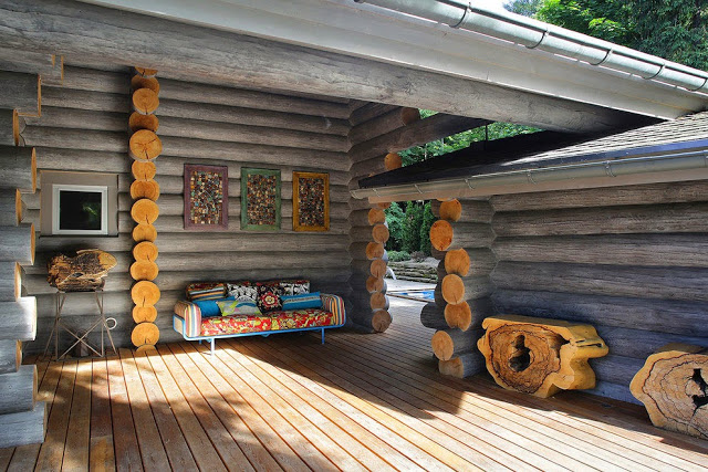Одноэтажный бревенчатый дом площадью 140 кв.м словно затерялся среди пышных лесов Подмосковья и высокие деревья вокруг защищают его от посторонних глаз. Привлекает внимание нестандартное решение экстерьера: тонированный в серый цвет
