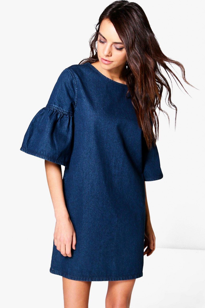 Девушкам с типом фигуры «груша» требуется дополнительный объем в верхней части. Таким женщинам рекомендованы джинсовые платья с оборками и воланами на плечах. Такой декор уравновесит верхнюю и нижнюю часть образа.