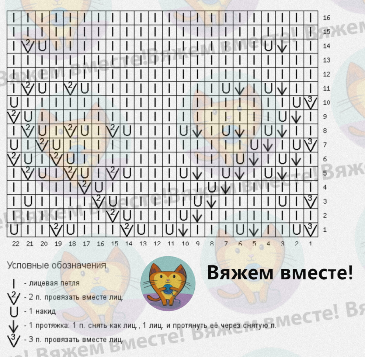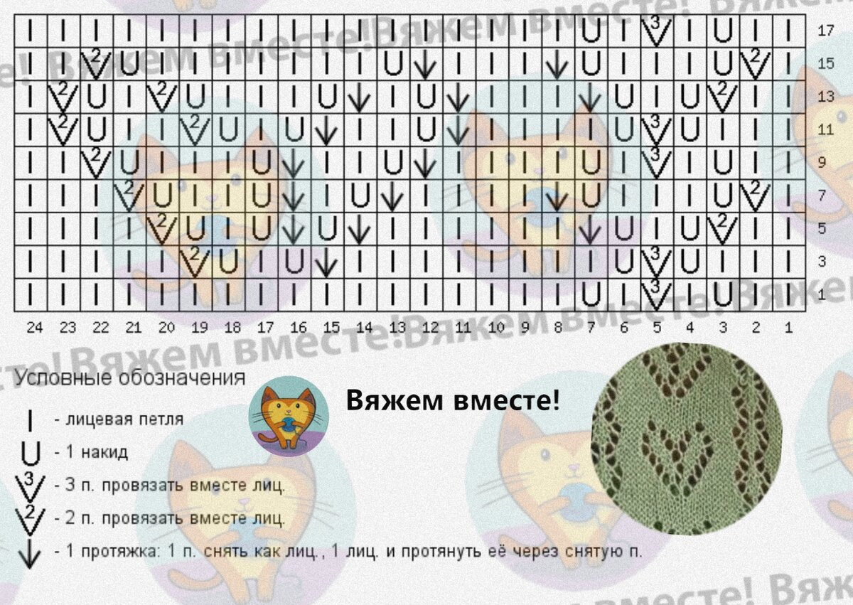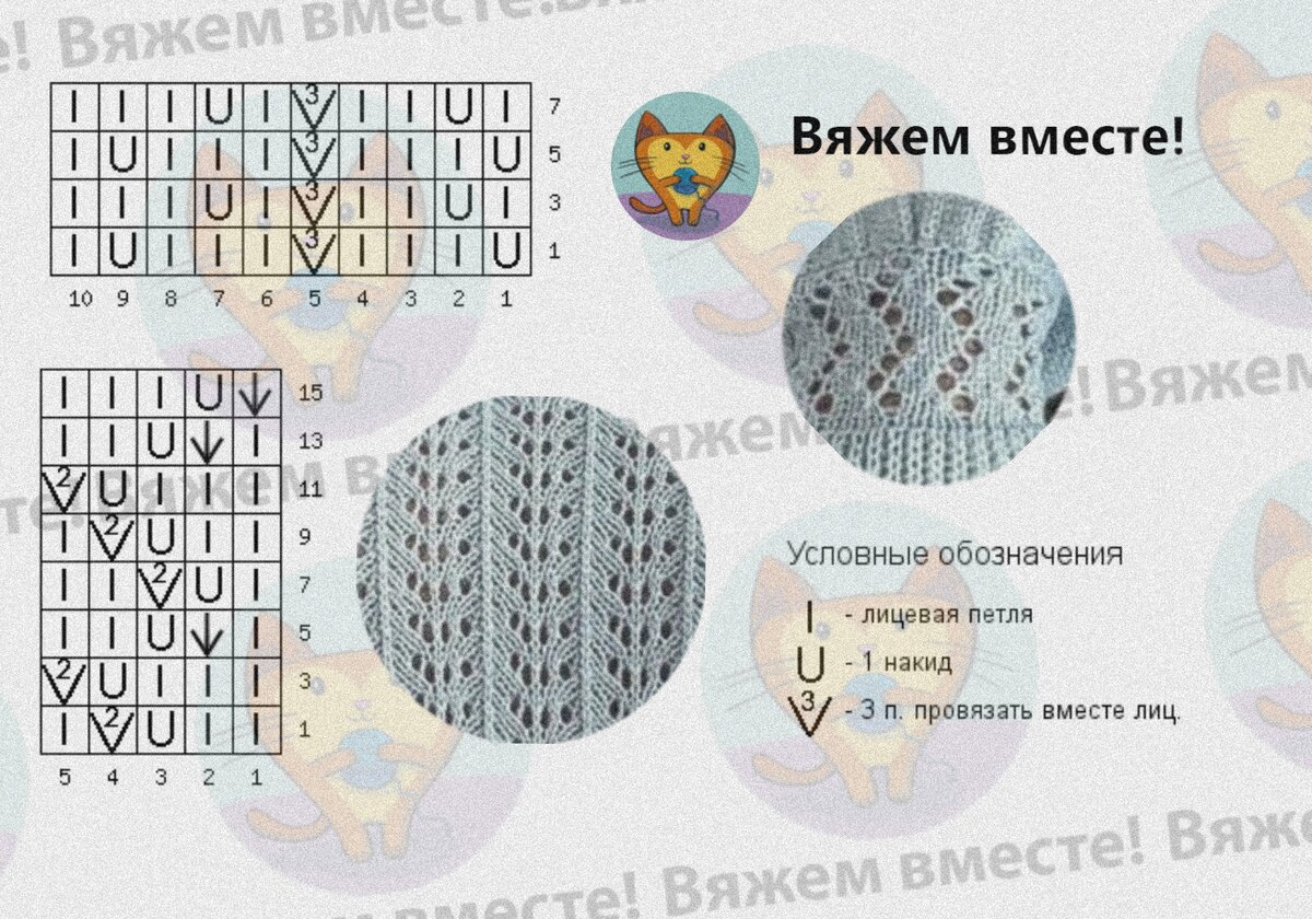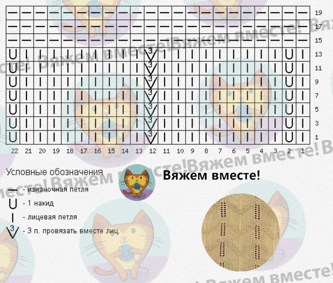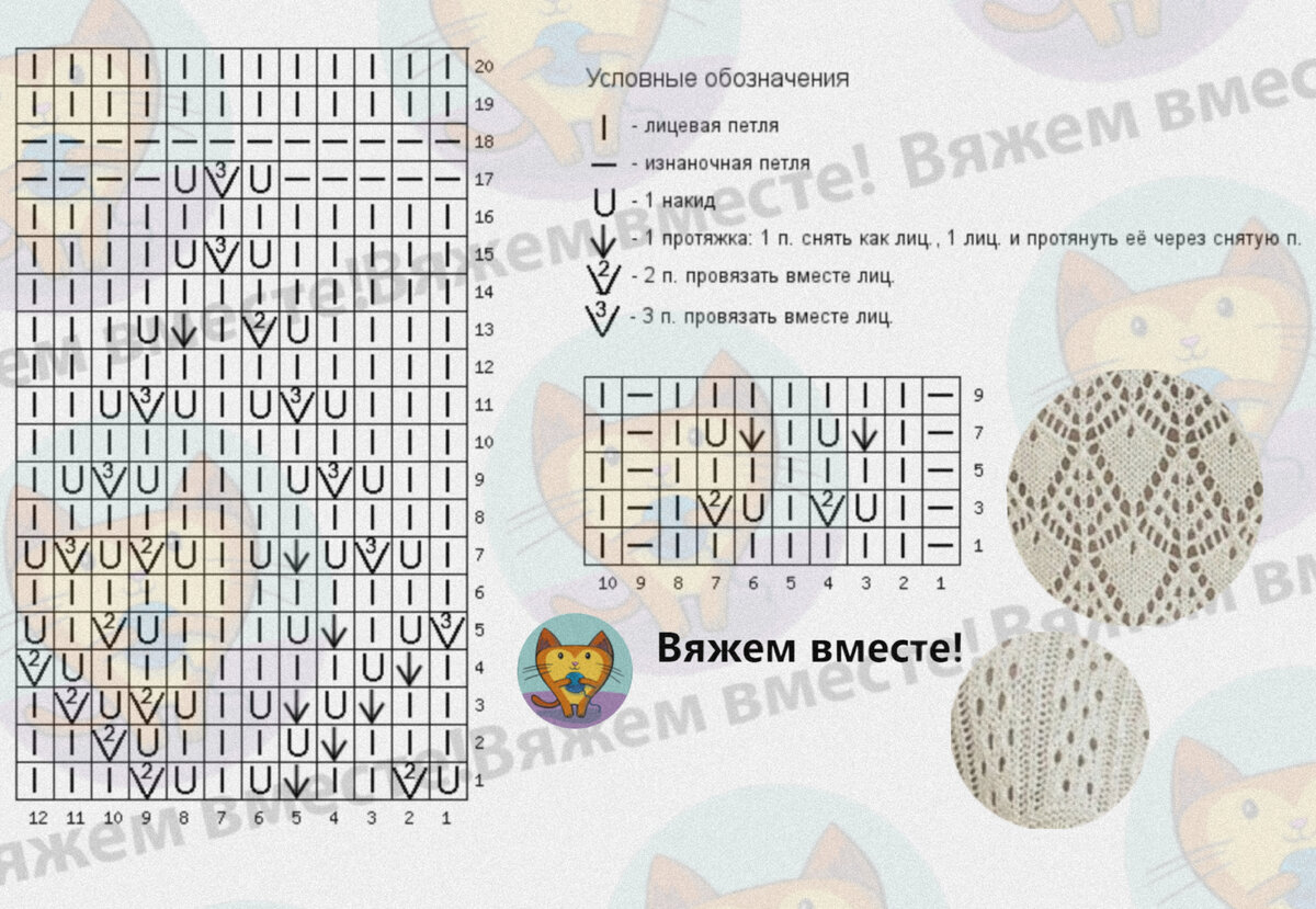 Схемы даны для кругового вязания, при вязании поворотными рядами, в чётных рядах поменяйте все лицевые на изнаночные и наоборот, эти ряды читайте слева направо.