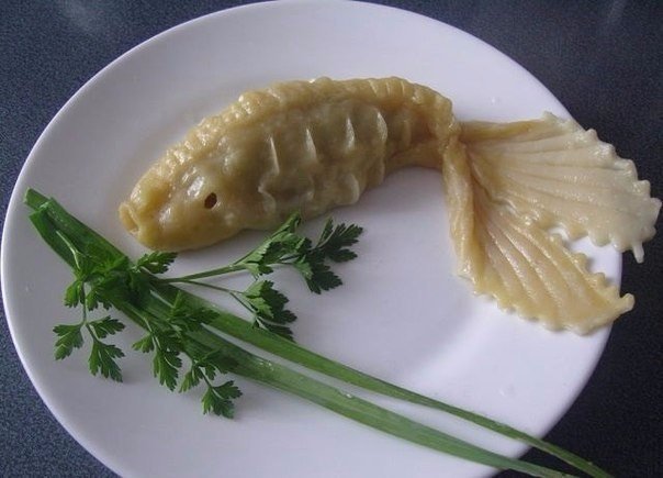 Вот такие рыбки, загляденье...но разве их можно есть...на них надо любоваться! А ведь ничего необычного тут нет,простое тесто,как для пельменей, а сколько выдумки,правда начинка не мясная, а из размельченного арахиса,впрочем смотрите и любуйтесь! Готовится на пару минут 10-15. Глядишь,кто-то и решится сотворить такой шедевр!