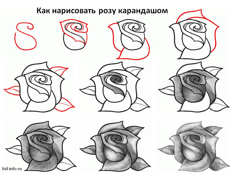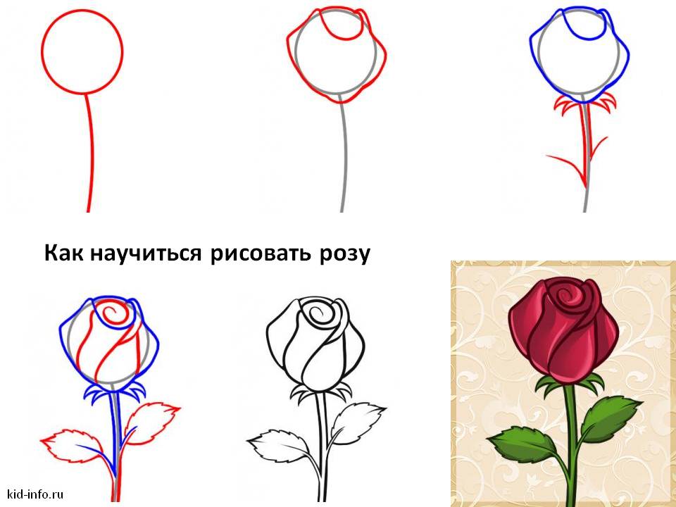 Используя данные инструкции поэтапного рисования розы, оформить открытку или рисунок смогут доже самые маленькие. Конечно же, если немного помогут родители.