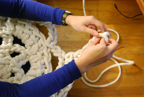 Берем схему любой ажурной салфетки, но вместо крючка и пряжи используем бельевую веревку (или тонкий канатик) и пальцы рук. То есть делаем пальчиками петельки из веревки и так вяжем по стандартной схеме салфетки. И получается вот такая красота: