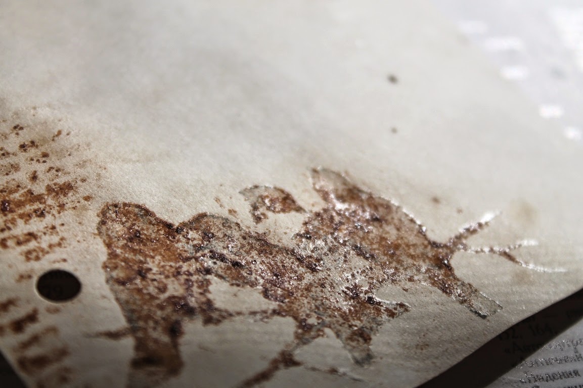 Через пару минут стряхиваю излишки, даже счищаю мастихином и начинаю нагревать феном для эмбоссинга. Здесь важно не бояться пережарить - как раз пережаривать и надо, чтобы вот это сочетание кофе+клей начало пузыриться, вздуваться, чернеть, обугливаться.