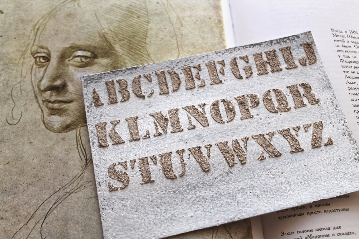 Беру трафарет с алфавитом и наношу полученную пасту на фон с помощью мастихина.