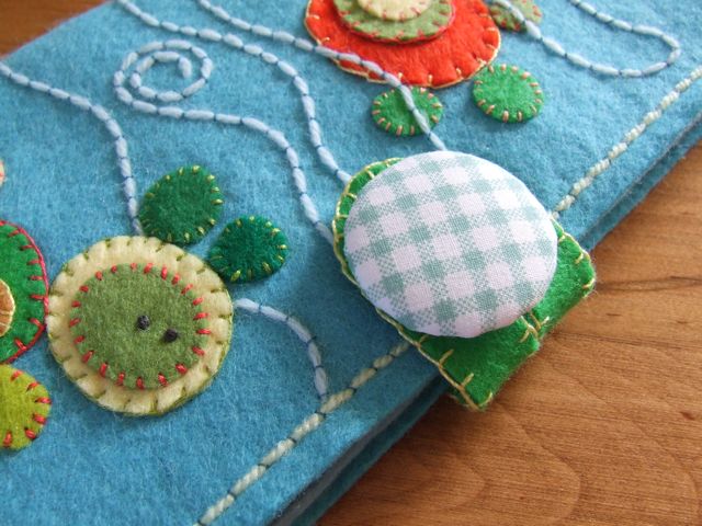 Осталось сделать застежку органайзера. Используем небольшой овальный кусочек войлока с прорезью посередине. Обшиваем его одеяльным швом. Пришиваем одну часть к задней стороне органайзера, к лицевой части пришиваем пуговицу, обтянутую тканью.