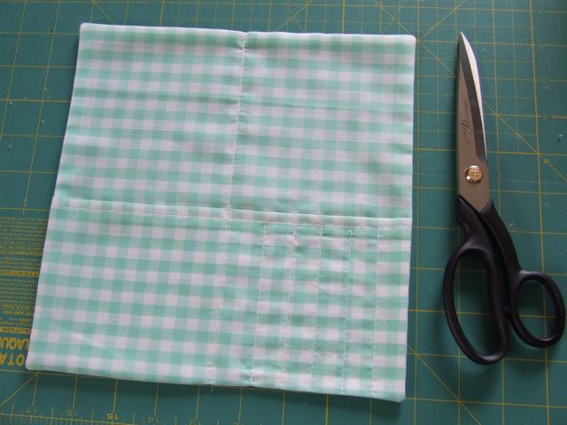 Обрабатываем один длинный край швом в подгибку с закрытым срезом у маленького прямоугольника, и прокладываем его внутрь большого квадрата между двумя слоями, как показано на рисунке. Скрепляем края квадрата на машинке, оставляя разрыв в нижней кромке.ыворачиваем на лицевую сторону.