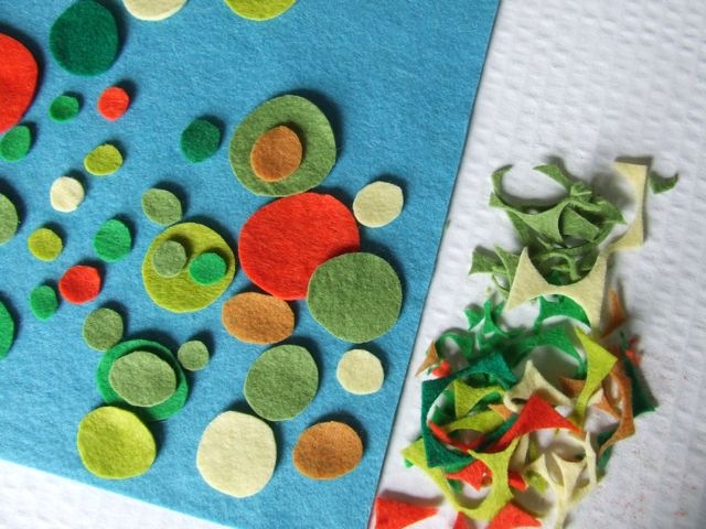 Выбираем среди фетрового разноцветия основной цвет, в проекте — это голубой и вырезаем квадрат 30*30 см.Из фетра других оттенков вырезаем круги разного диаметра.
