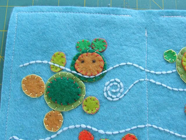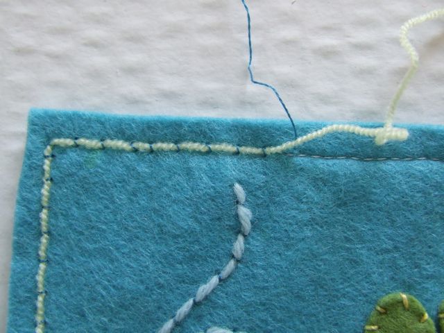 Оставлять наш органайзер в таком виде нельзя. Машинная строчка на войлочной основе все портит, поэтому не торопясь закрываем ее пряжей, используя технику Коучинга. Как это сделать, вы уже знаете, а кто не помнит смотрим начало поста [показать] .