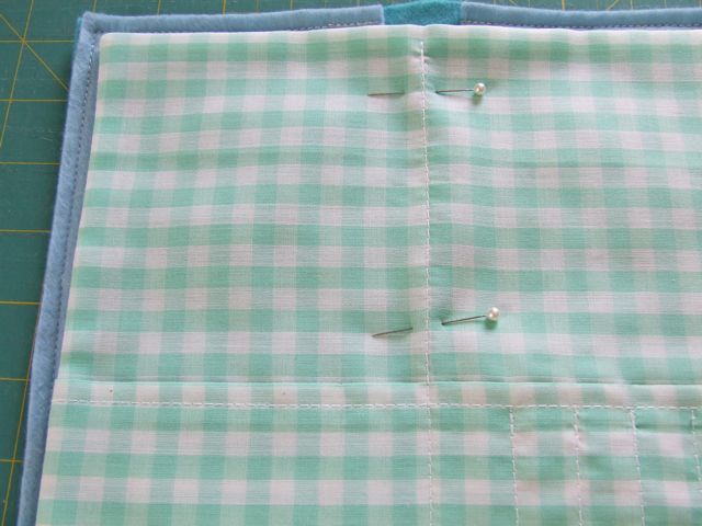 Теперь скрепляем войлочную основу органайзера с тканевой с изнанке, чтобы ткань не сдвинулась скрепляем иголками..