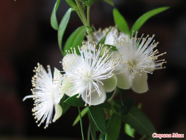 Этот вечнозелёный кустарник цветёт маленькими белыми цветами. Онобладает, кроме красоты, ещё целебными свойствами. Само слово «мирт»переводится с греческого как «бальзам».
