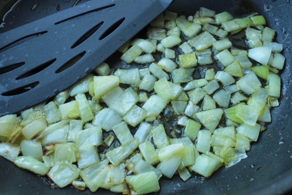 Добавить нарезанные кабачки и баклажаны. Все овощи режем небольшим кубиком со стороной примерно 0,5 см. Обжаривать все вместе 5 минут, непрерывно помешивая.