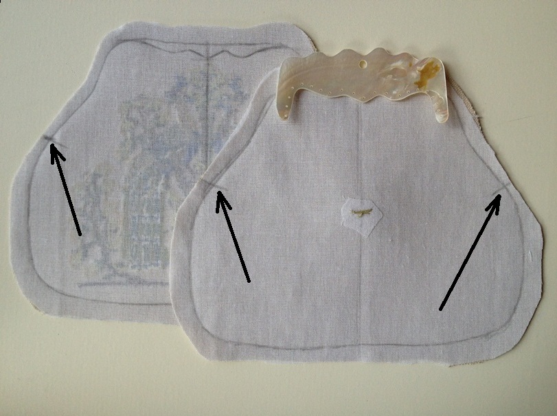 10. Подняла у обеих деталей подкладку до места пришива, приколола, чтобы не мешала. Внимание! Обе детали все еще вывернуты на изнанку!