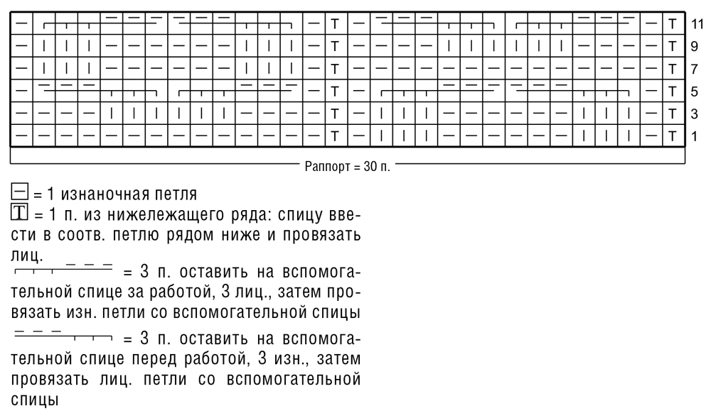 Вязать по схеме спицами №5. На схеме приведены только лицевые ряды, в изнаночных рядах петли провязывать по рисунку. В высоту повторять с 1-го по 12-й р. схемы.