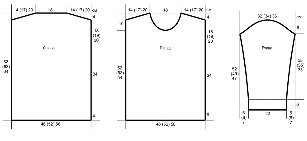 Начать, как спинку, но для горловины закрыть средние 14 п. на высоте 52 (53) 54 см от наборного ряда и обе стороны закончить раздельно.