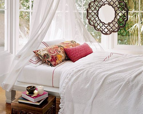 Зеркальное оформление потолка или стен, живые цветы ( например, букет из полевых цветов или долгоцветущие орхидеи), немного картин и сувениров помогут внести шарм в ваш романтический интерьер спальни.