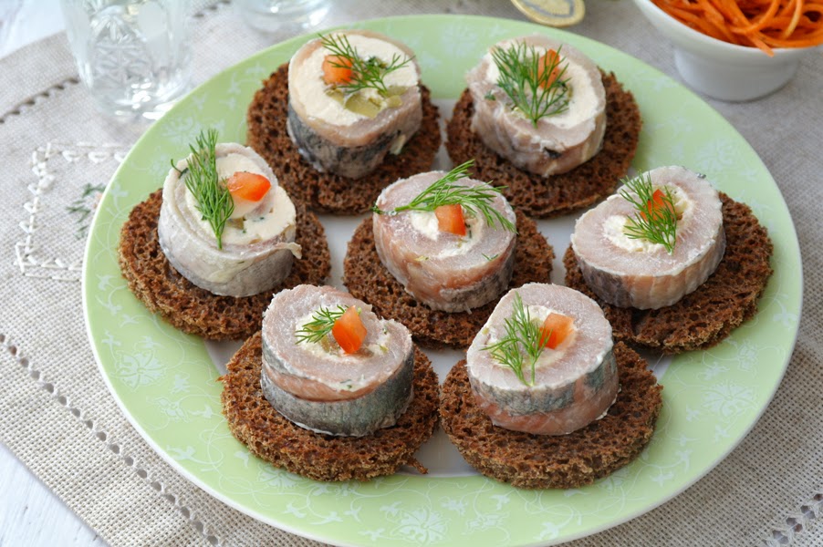 Из бородинского хлеба нарезать тонким стаканом кружочки для селедочных рулетов. Подсушить хлебные кружочки в духовке или на сковороде до состояния гренок.