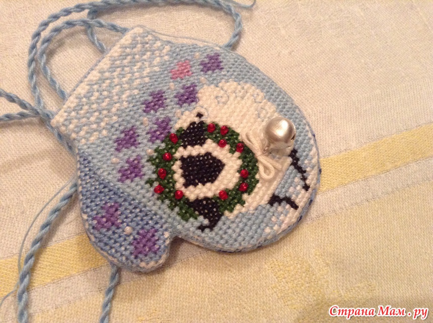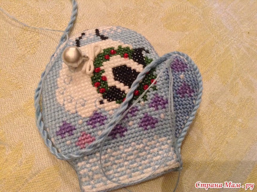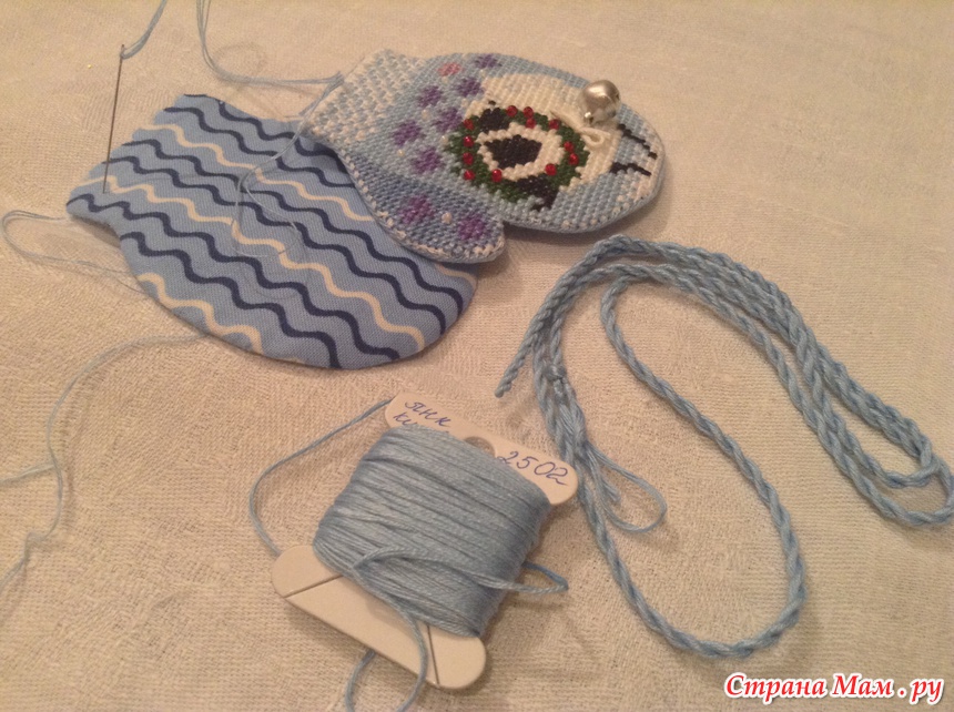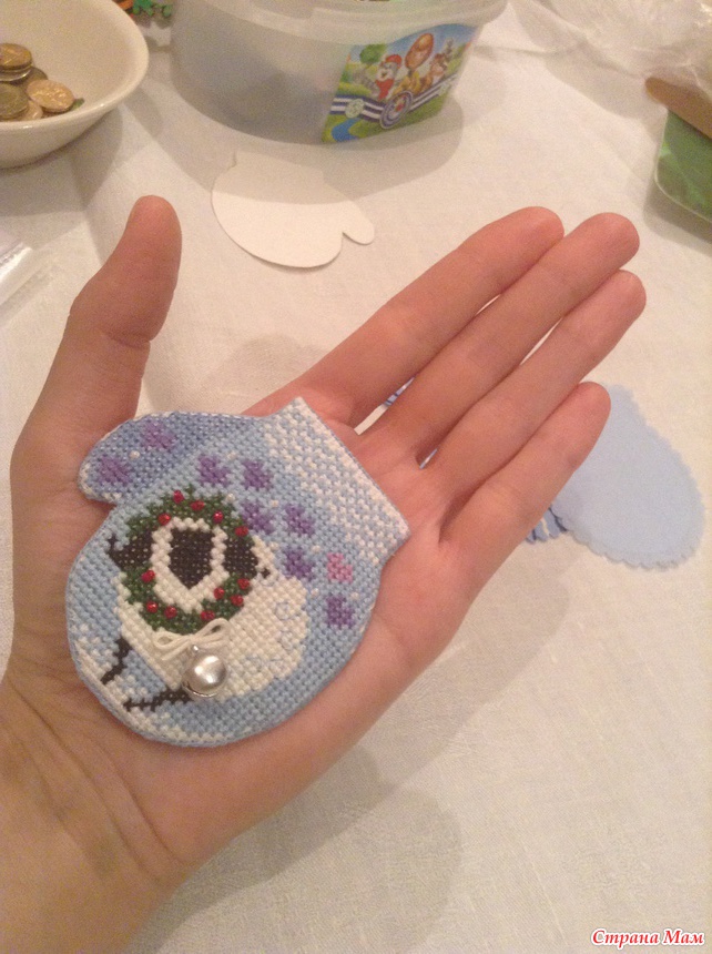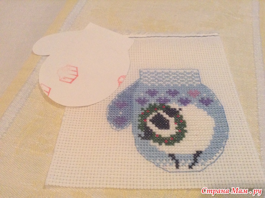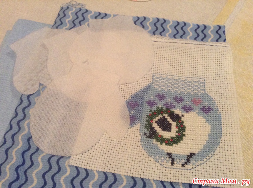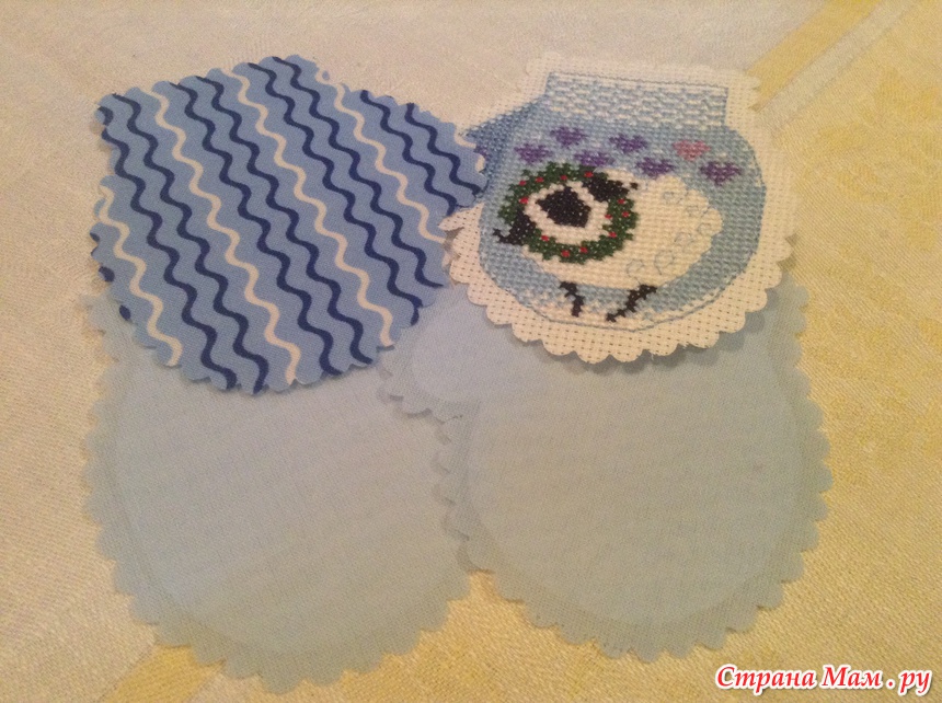 Обшиваем варежку бэком, я вышиваю в 2 нити для крепости, делаем выкройку варежки.
