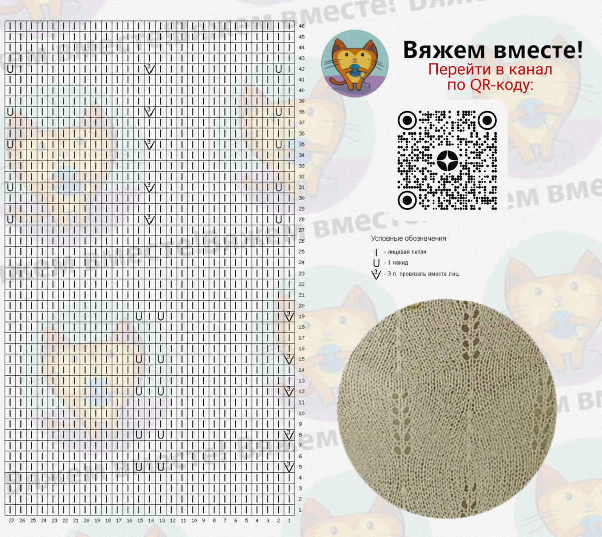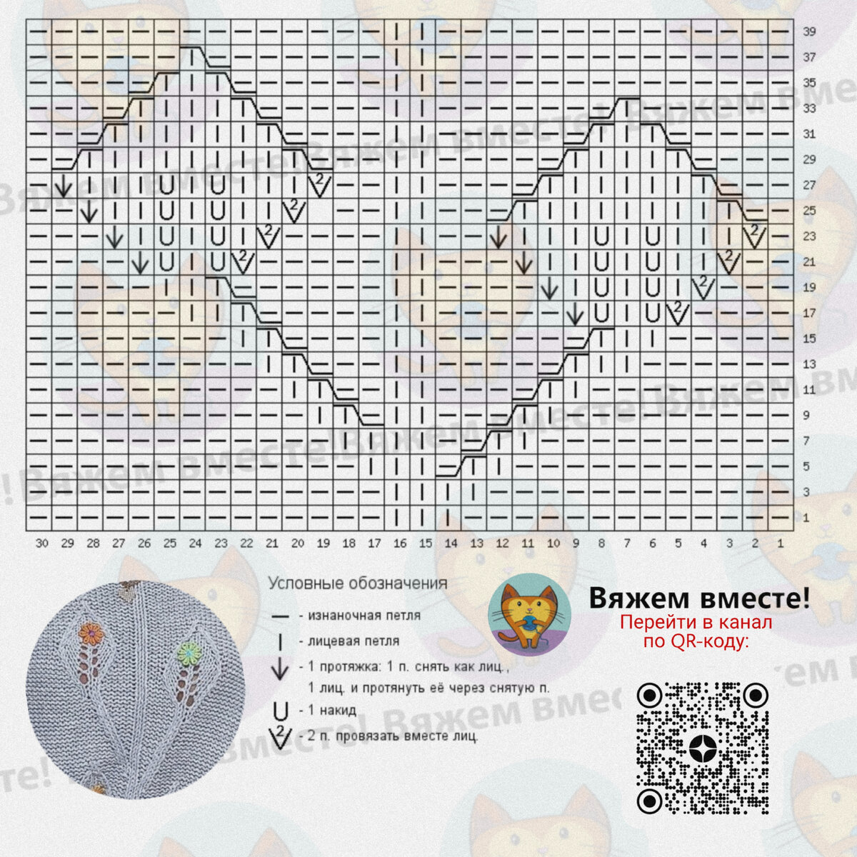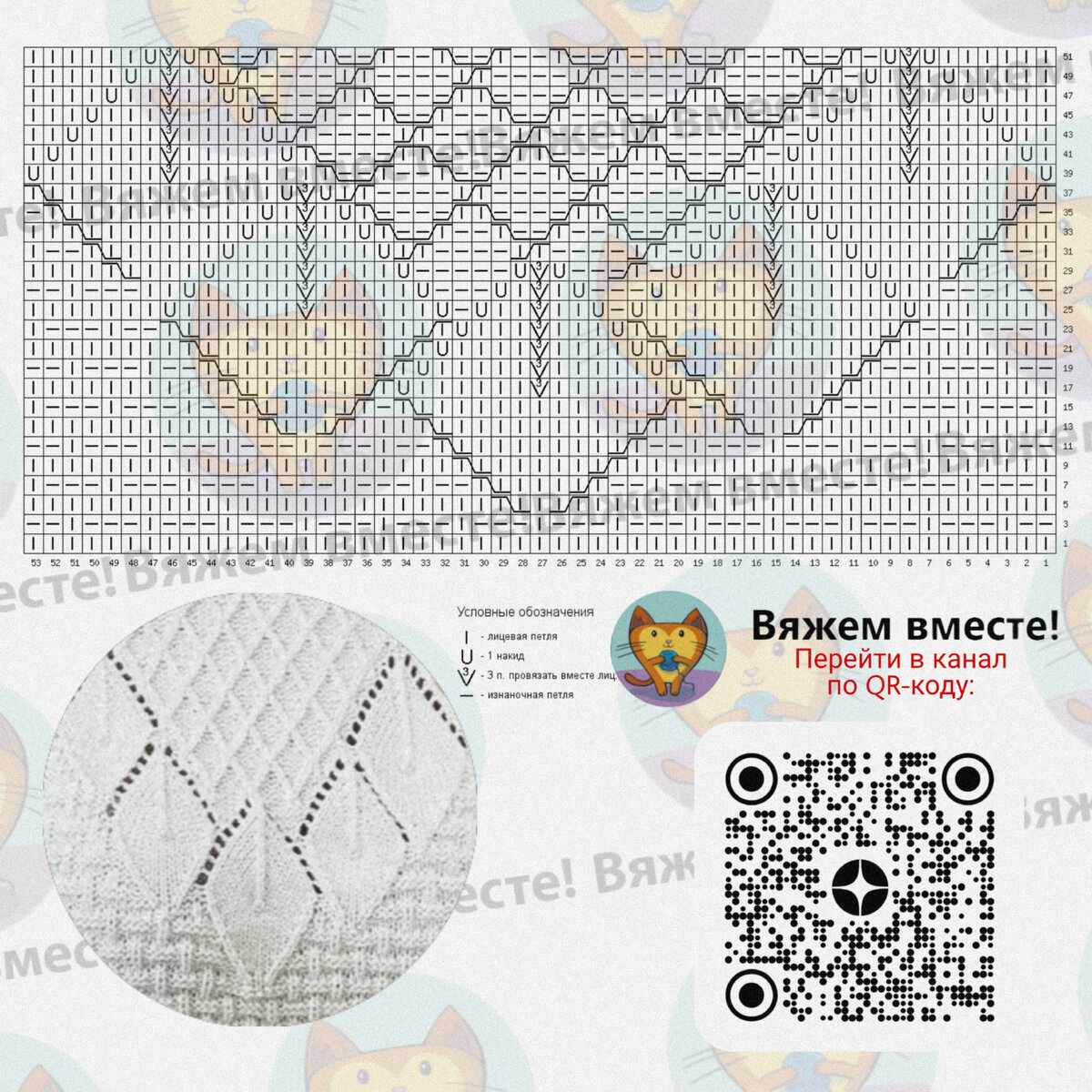 Знаю, что многие читатели канала с особым интересом относятся к треугольным кокеткам. Специально для них приготовила схему узора белого джемпера с высокой горловиной, который украшен треугольником из листьев.