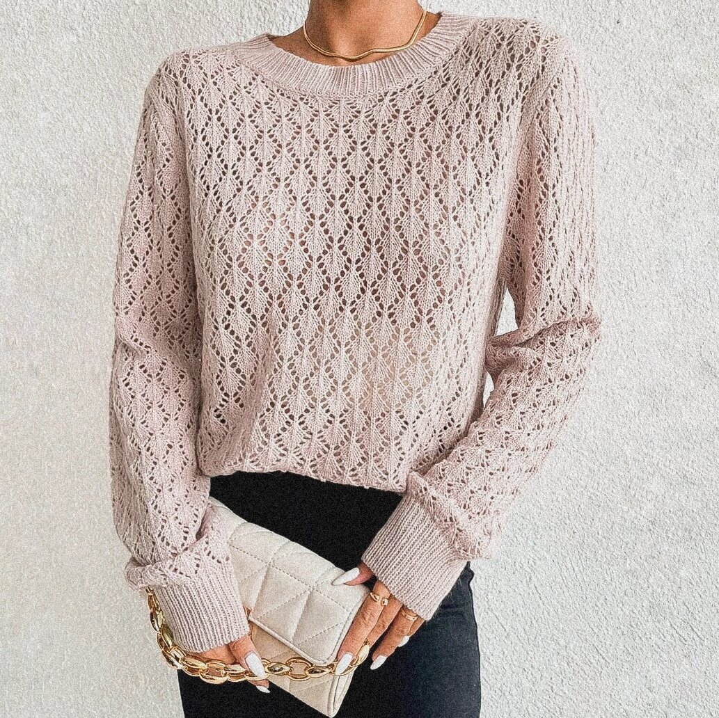Розовый джемпер с ажурным узором, отдалённо напоминающим листья, из магазина Шейн. Модель выполнена прямыми деталями спинки и переда, рукава сужены к манжете.