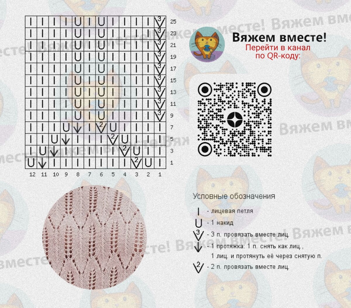 В отличие от предыдущих схем, на схеме к этому узору указаны не только лицевые ряды, но ещё и изнаночные, при этом обозначения даны так, как петли лежат на лицевой стороне полотна.