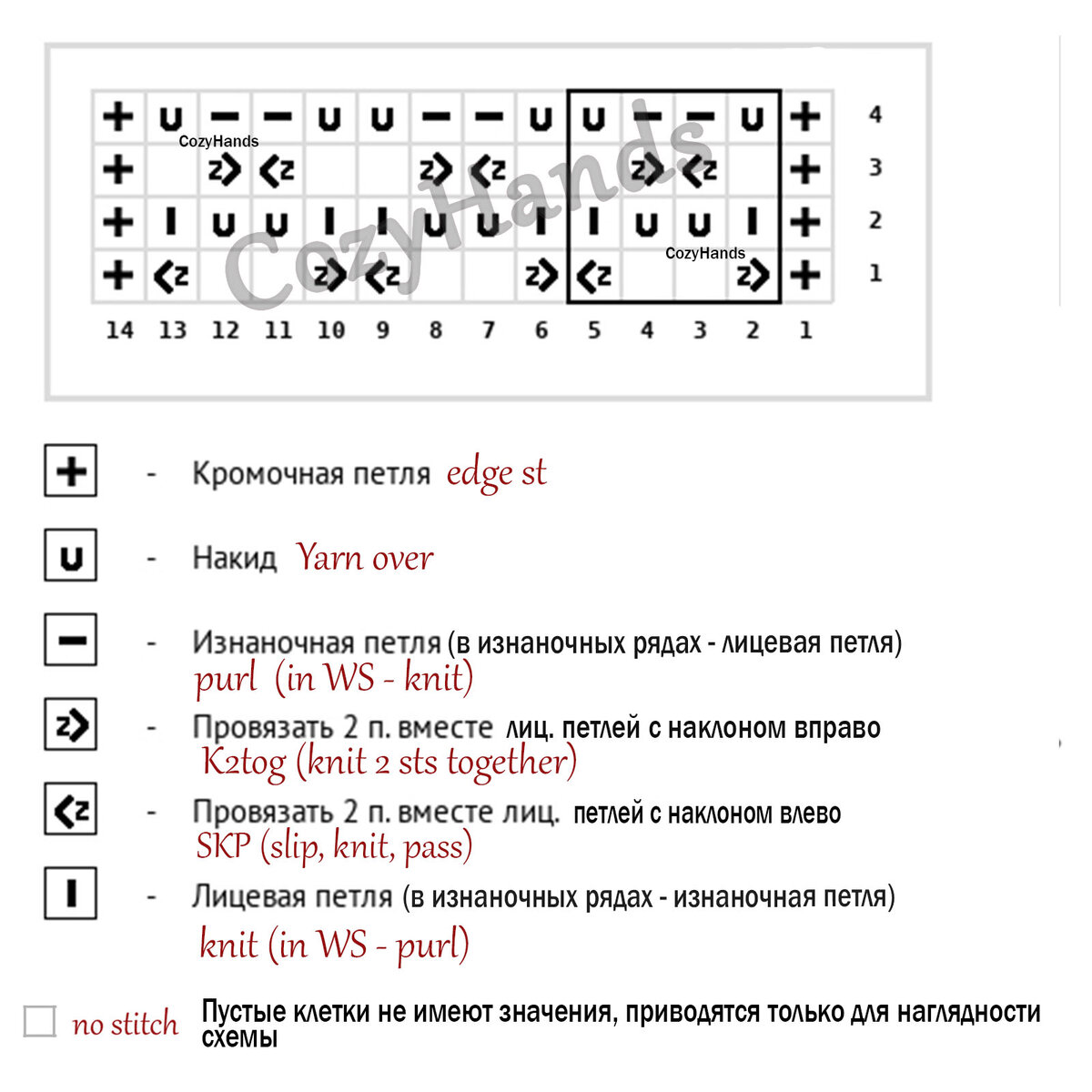 Раппорт узора состоит из 4 петель и 4 рядов.