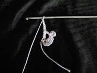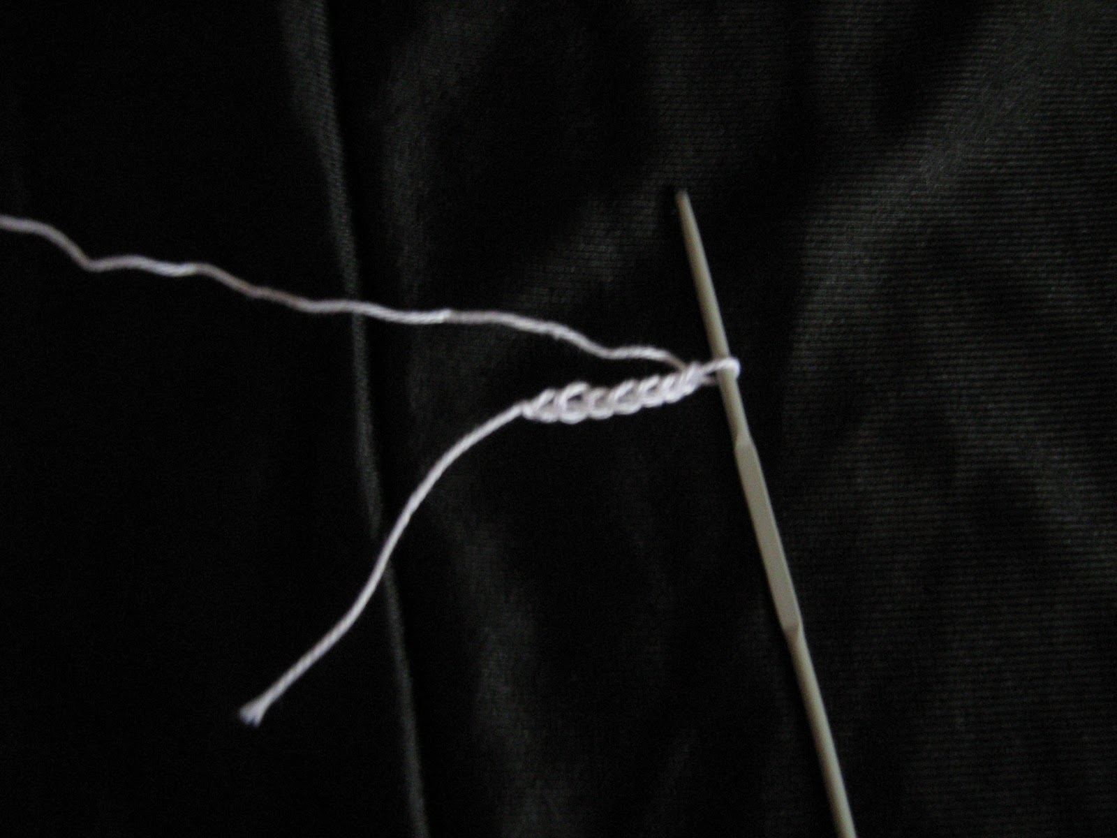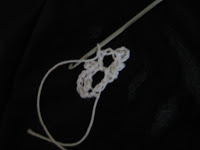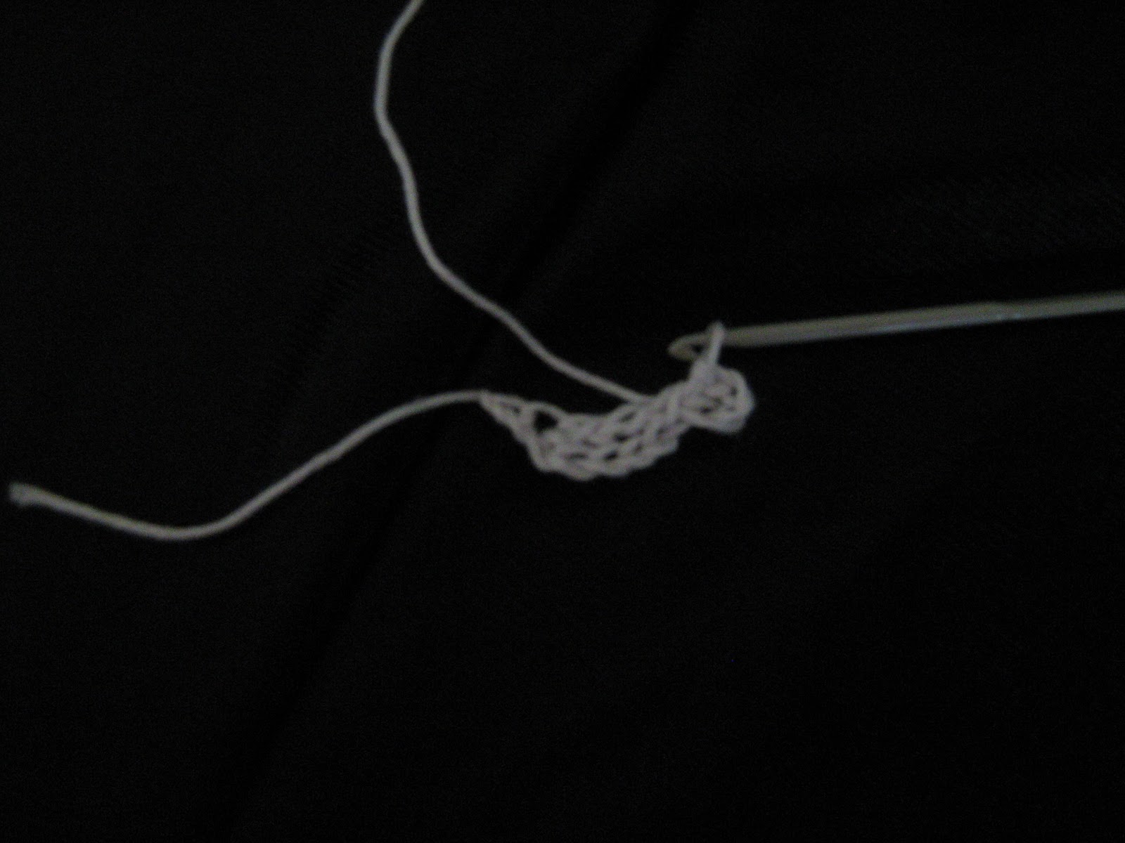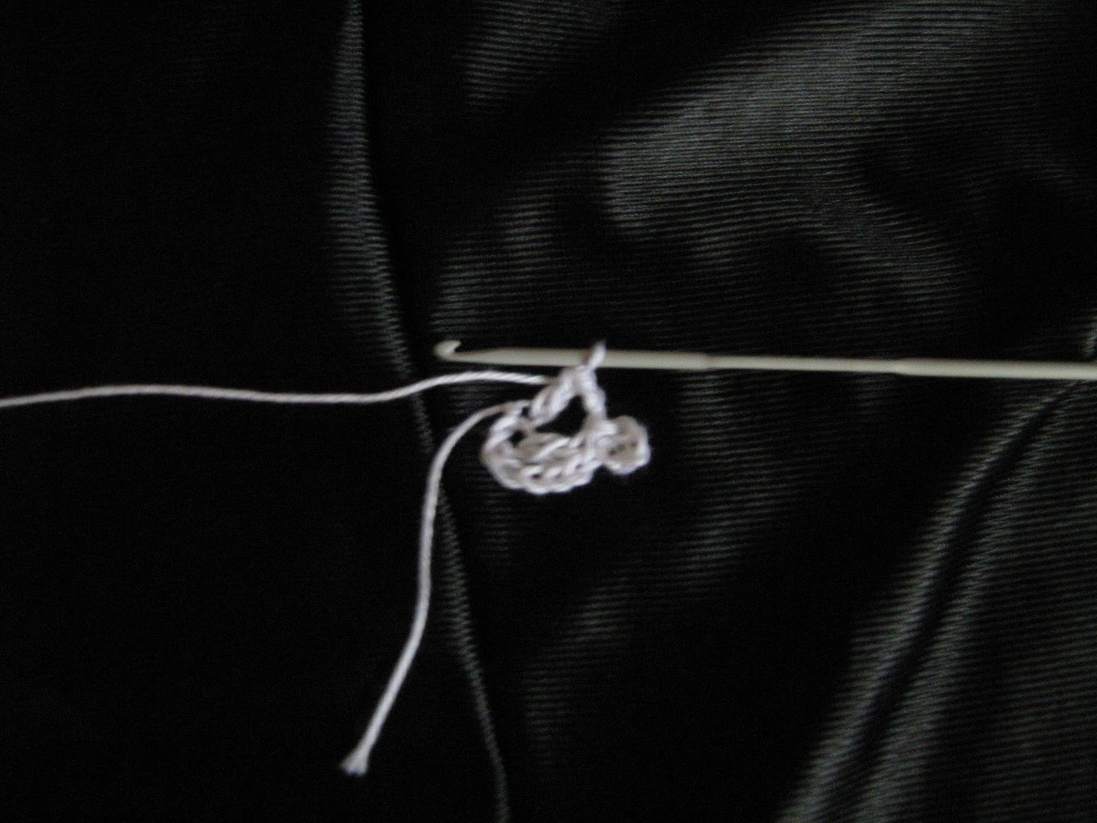 1 ряд: 7 воздушных,1 столбик с накидом (далее – ССН) в шестую от крючка воздушную петлю (далее – ВП), 4 ВП, соединительный столбик в верхушку ССН (пико), 2 ВП, 1ССН в первую из семи ВП первой цепочки:
