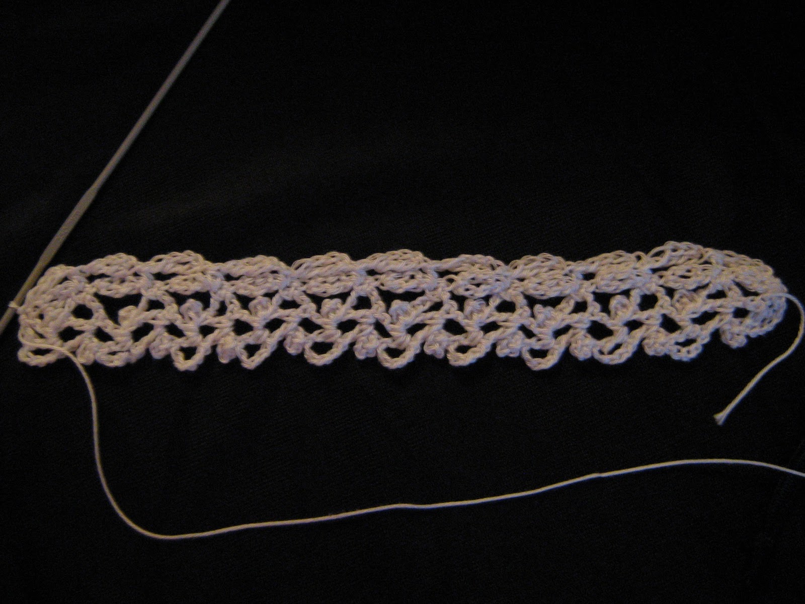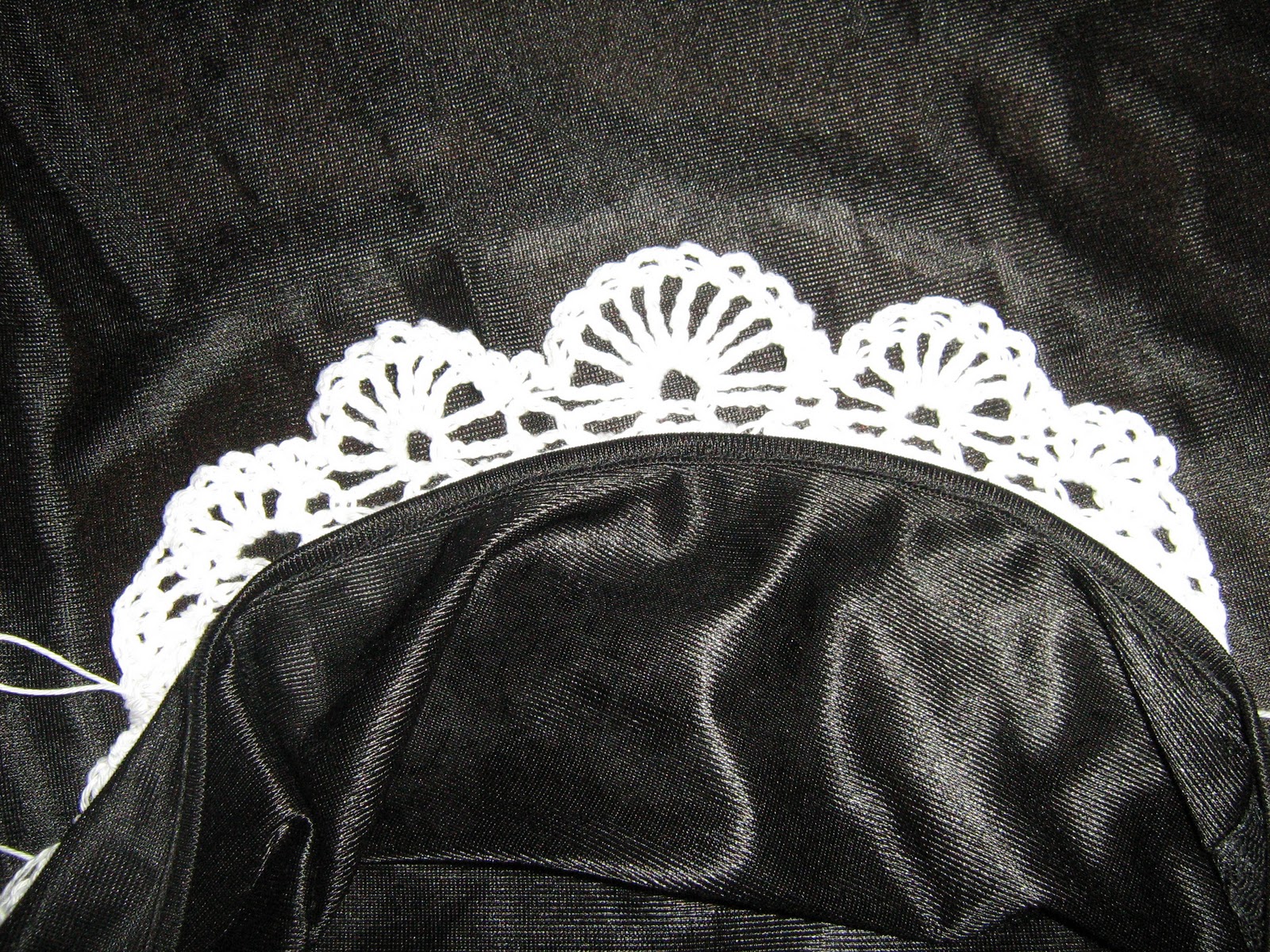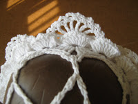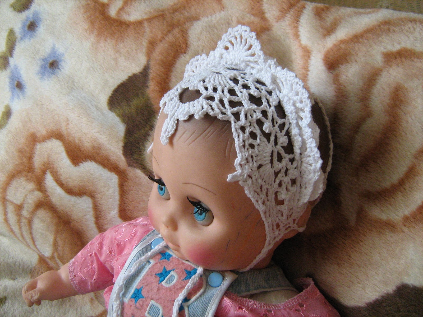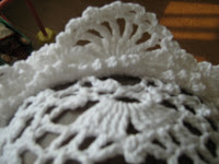 Закрепительная оборка спереди: взяв работу лицевой стороной к себе, вязать за свободные СС2Н тех групп столбиков, где вязался первый ряд полей чепчика. Пропустить первую группу, присоединить нить соединительным столбиком за цепочку из СС2Н следующей группы: (3ВП, 1СБН за цепочку следующей группы, (3ВП, 1СБН за ту же цепочку) х 5 раз) х 7 раз; 3ВП, соединительный столбик за цепочку следующей группы. Отрезать нить. Накрахмалить оборки, придать форму и высушить.