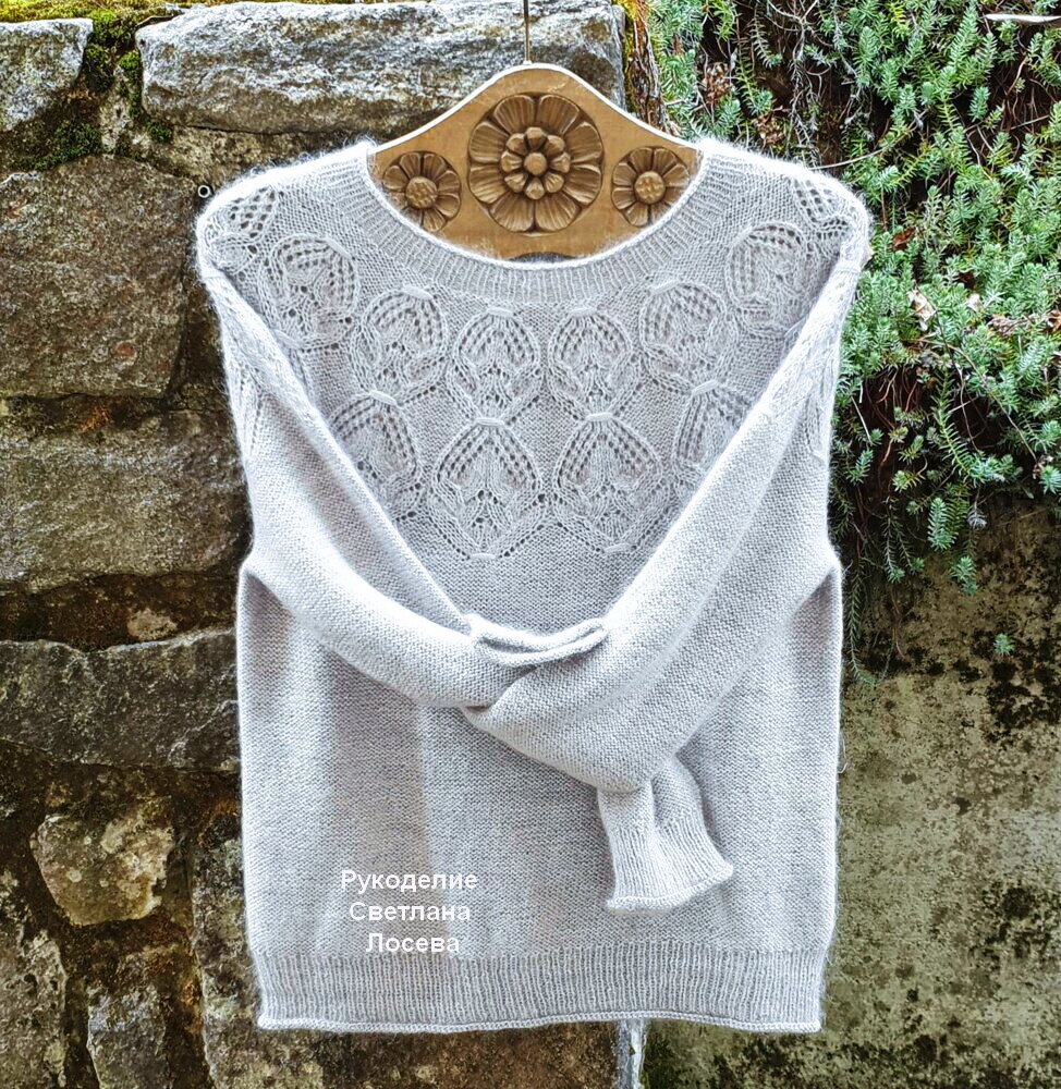 Конструктивно модель вяжется без швов одной деталью сверху вниз. Основное полотно выполнено изнаночной гладью. На свободу облегания берется от 8,5 до 11.5 см.