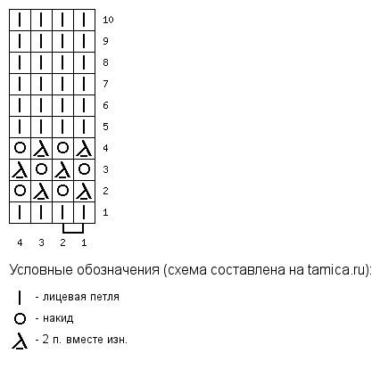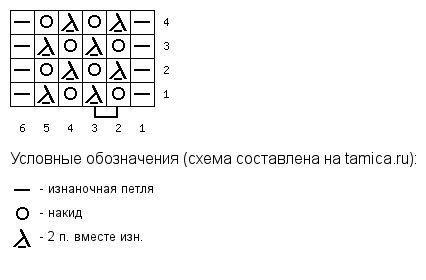 Схема основного узора также содержит и лицевые, и изнаночные ряды. Раппорт узора — 2 петли и 2 ряда.