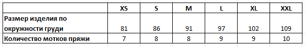 В таблице ниже вы найдёте свой размер по ширине готового изделия (в сантиметрах), и сориентируетесь по количеству мотков для вашего размера.
