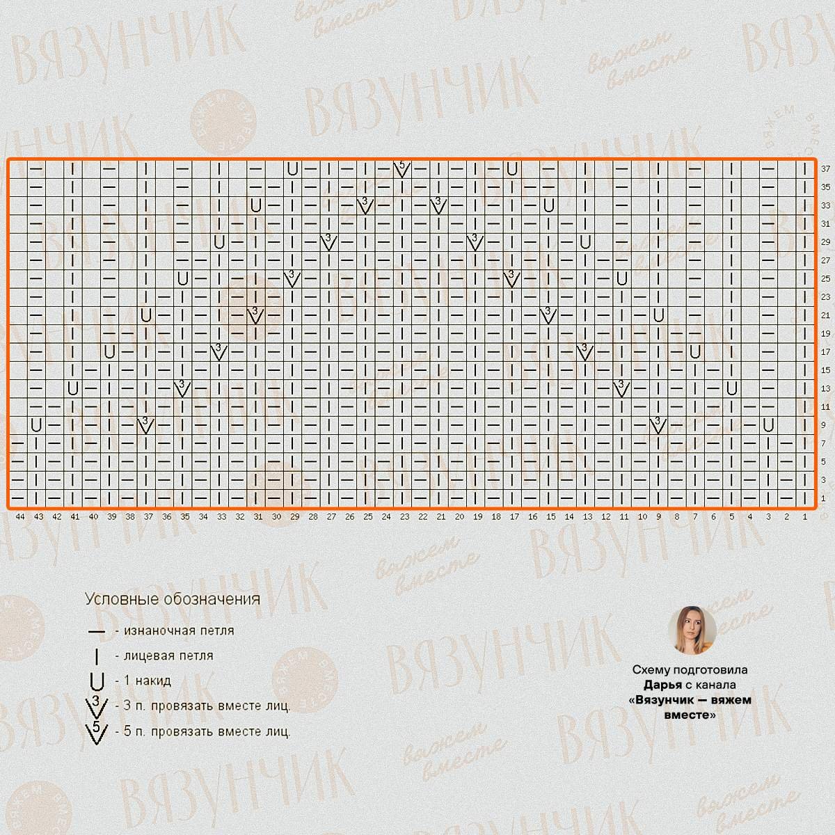 На схемах только лицевые ряды при вязании по кругу. Изнаночные ряды вяжите либо согласно обозначениям, либо по рисунку.