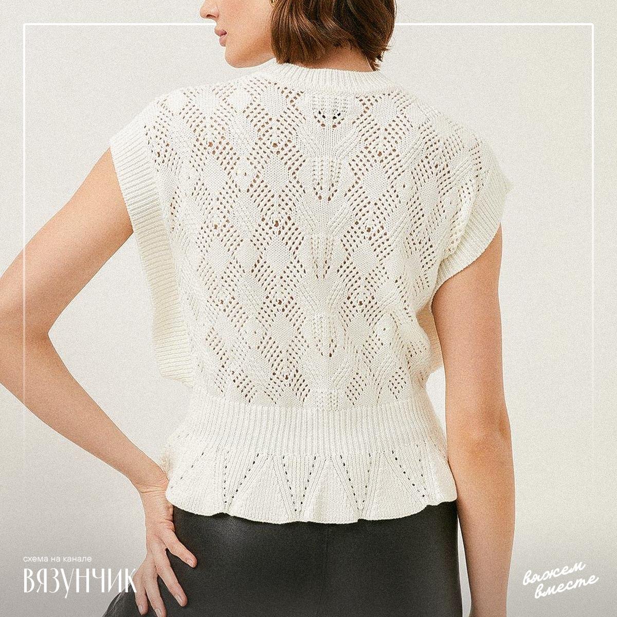 Небольшие ажурные ромбы, вертикально направленные узоры, акцент на талии, баска — очень женственно и аккуратно.