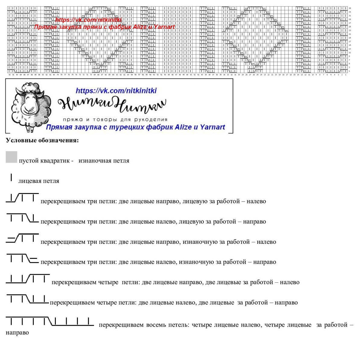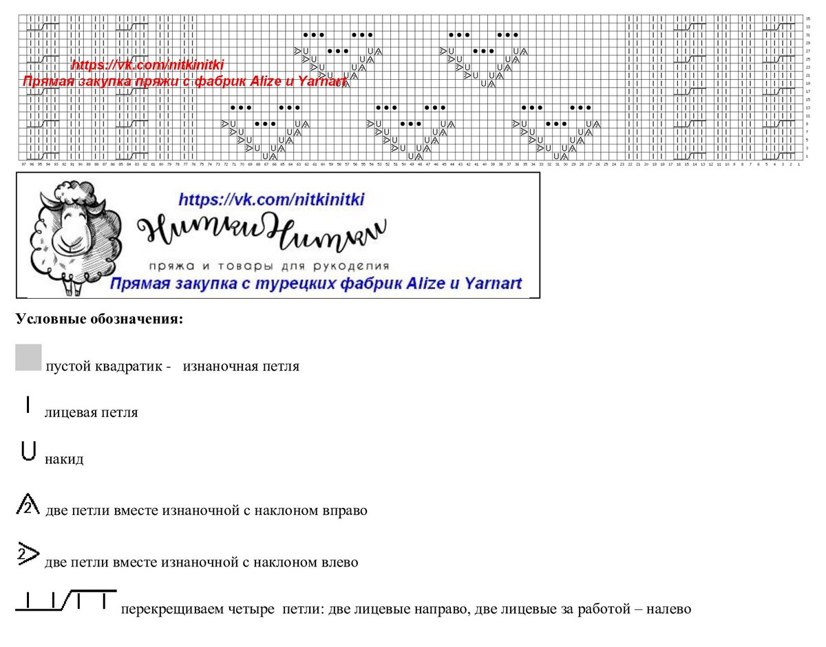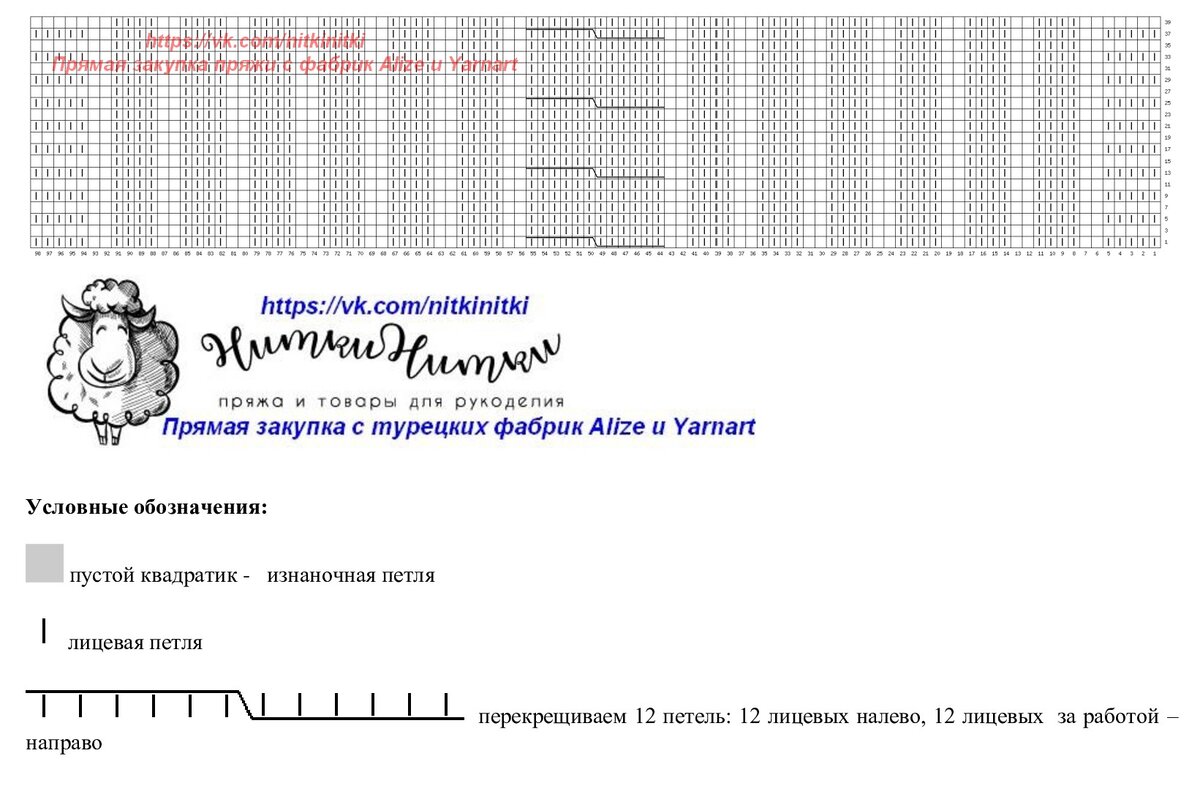 На схеме - один раппорт узора в высоту (48 рядов). В ширину раппорт с 1 по 29 петли + одна петля для симметрии. Схема составлена для лицевых рядов, изнаночные вяжем по рисунку.