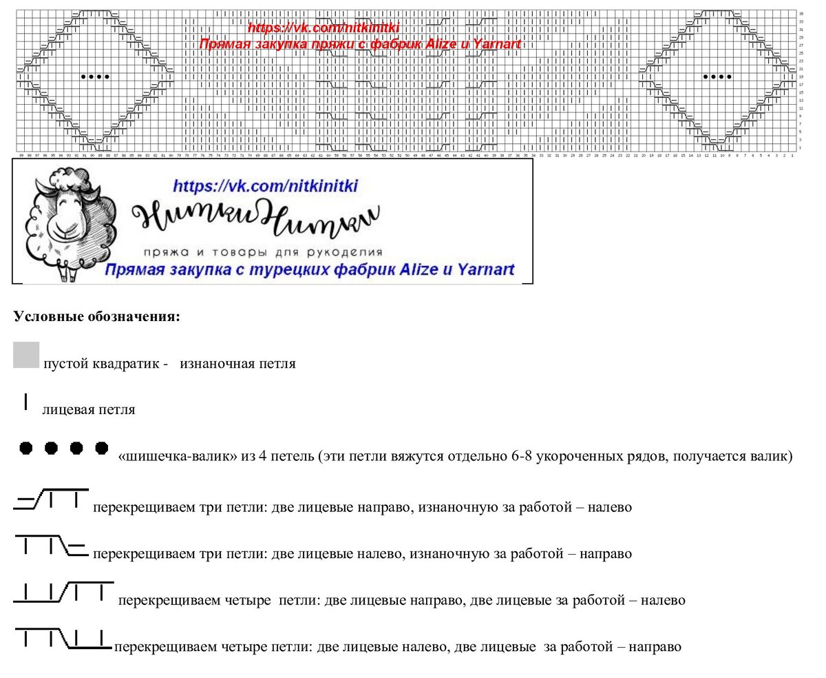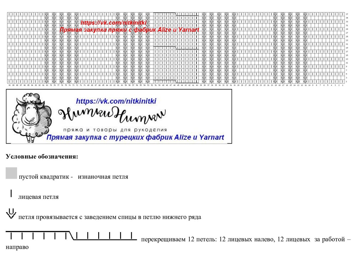 На рисунке - схема вязания узора. В ширину раппорт 14 петель (отмечен внизу схемы специальным маркером). В высоту полный раппорт составляет 16 рядов, а частичный (на который удобнее ориентироваться) - шесть рядов.