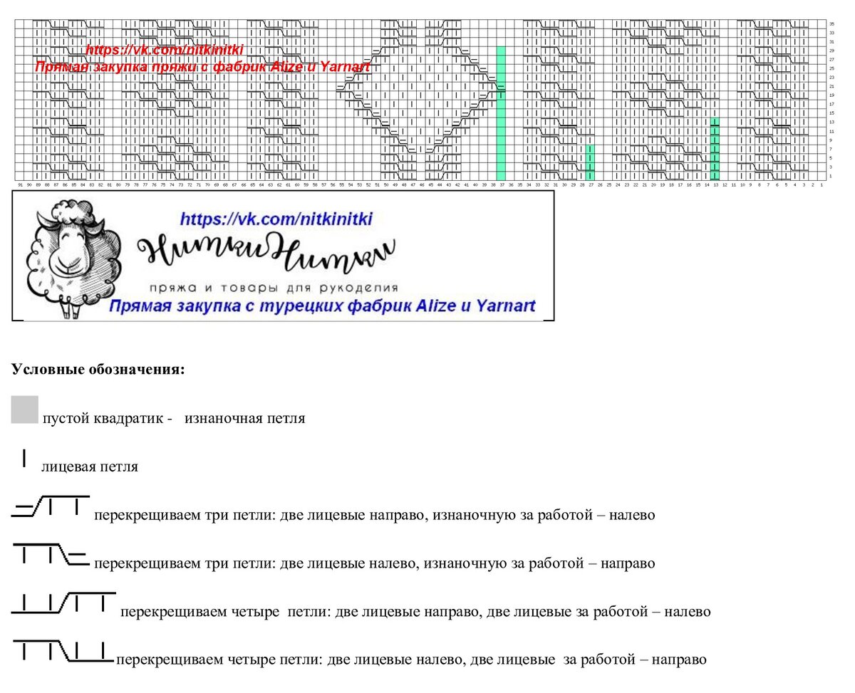 На рисунке - схема вязания рельефных узоров, раппорт каждого отмечен по краю зеленым цветом. Остальные петли справа и слева вяжутся жемчужным узором.