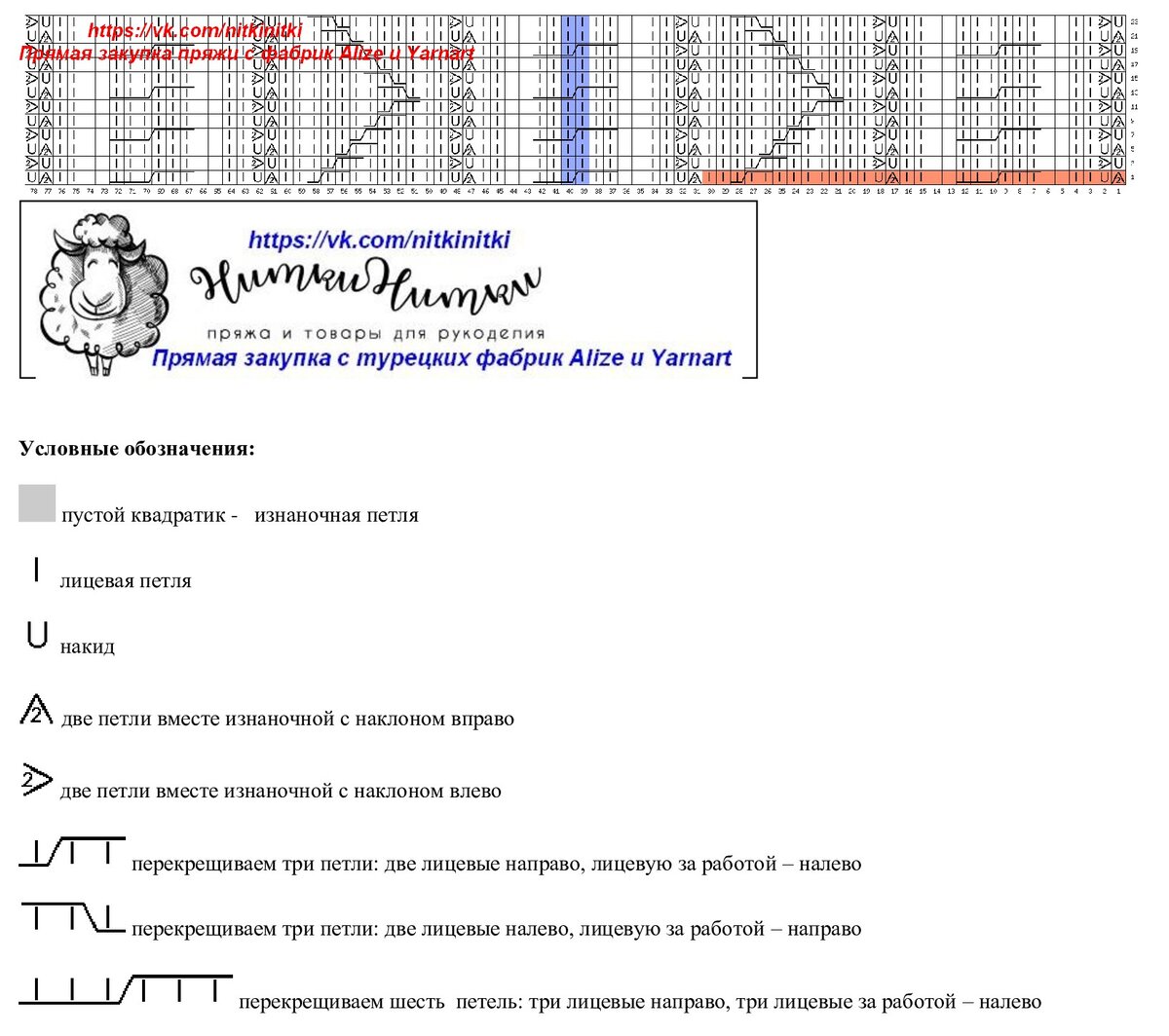 На схеме нарисованы два раппорта узора в высоту и один в ширину (выделен внизу). В этом узоре нужно обратить внимание, что петли, отмеченные оранжевым цветом, изнаночные. Именно так сделано в оригинале (там напрашиваются лицевые петли).
