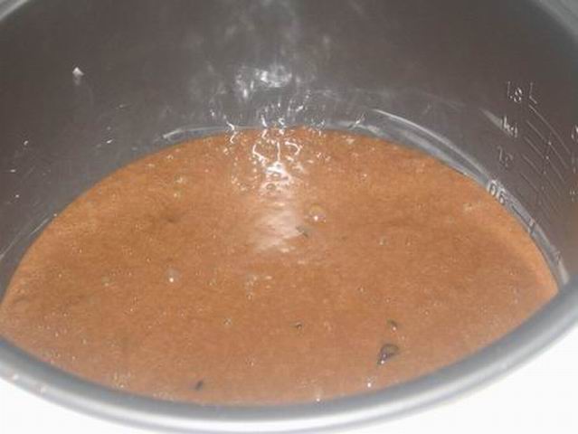 И выливаем в предварительно смазанную кастрюлю мультиварки, ставим в режим ВЫПЕЧКА на 65 минут.