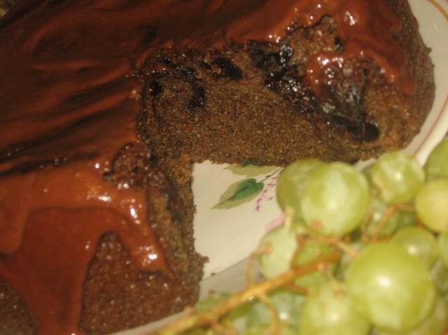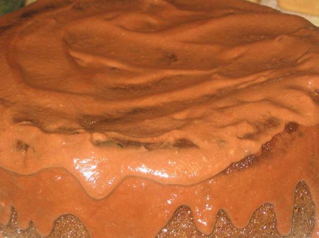 Заливаем его приготовленной глазурью: 10 гр сметаны нагреваем, добавляем 3 столовые ложки какао и 2 столовые ложки сахара. Доводим до кипения, помешивая, кипятим 1-2 минуты.