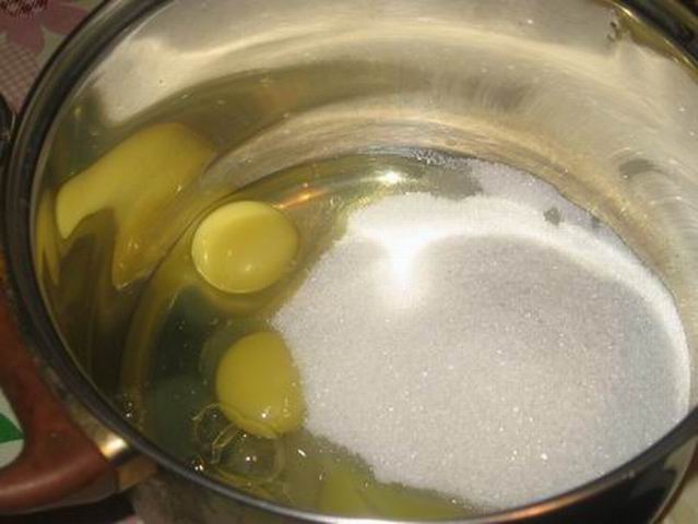 Теперь можно начать приготовление самого бисквита. Яйца взбиваем с сахаром. Слегка, только для их соединения. Хорошо будет, если сахар растворится полностью.